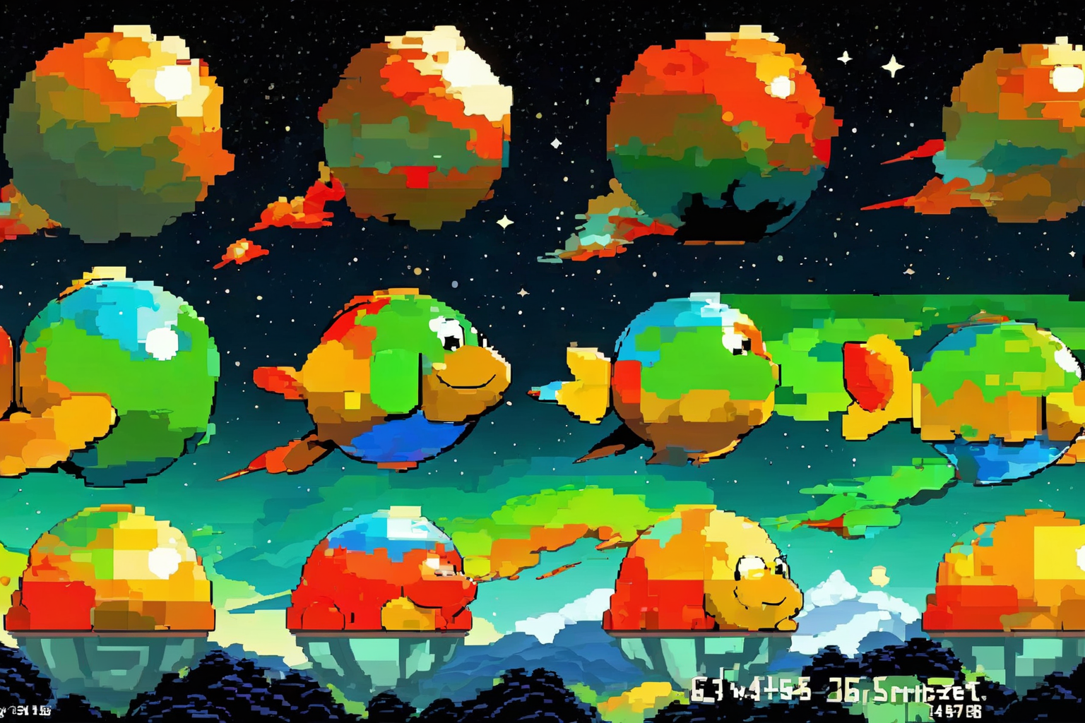 KOI 7978.01 exoplanet, Alexander Kosolapov style, Weather, Kepler-186f, KOI 7978, temperature, breeze, canyons, rust, hazy orange, atmospheric dust, visibility, kilometers, relatively clear day, phosphine showers, evening, early spectral analysis, geology, volcanic eruptions, southern hemisphere, space, exoplanet HD, sharp focus, stunningly beautiful, Bubble Bobble style, 8-bit, cute, pixelated, fantasy, vibrant, reminiscent of Bubble Bobble game