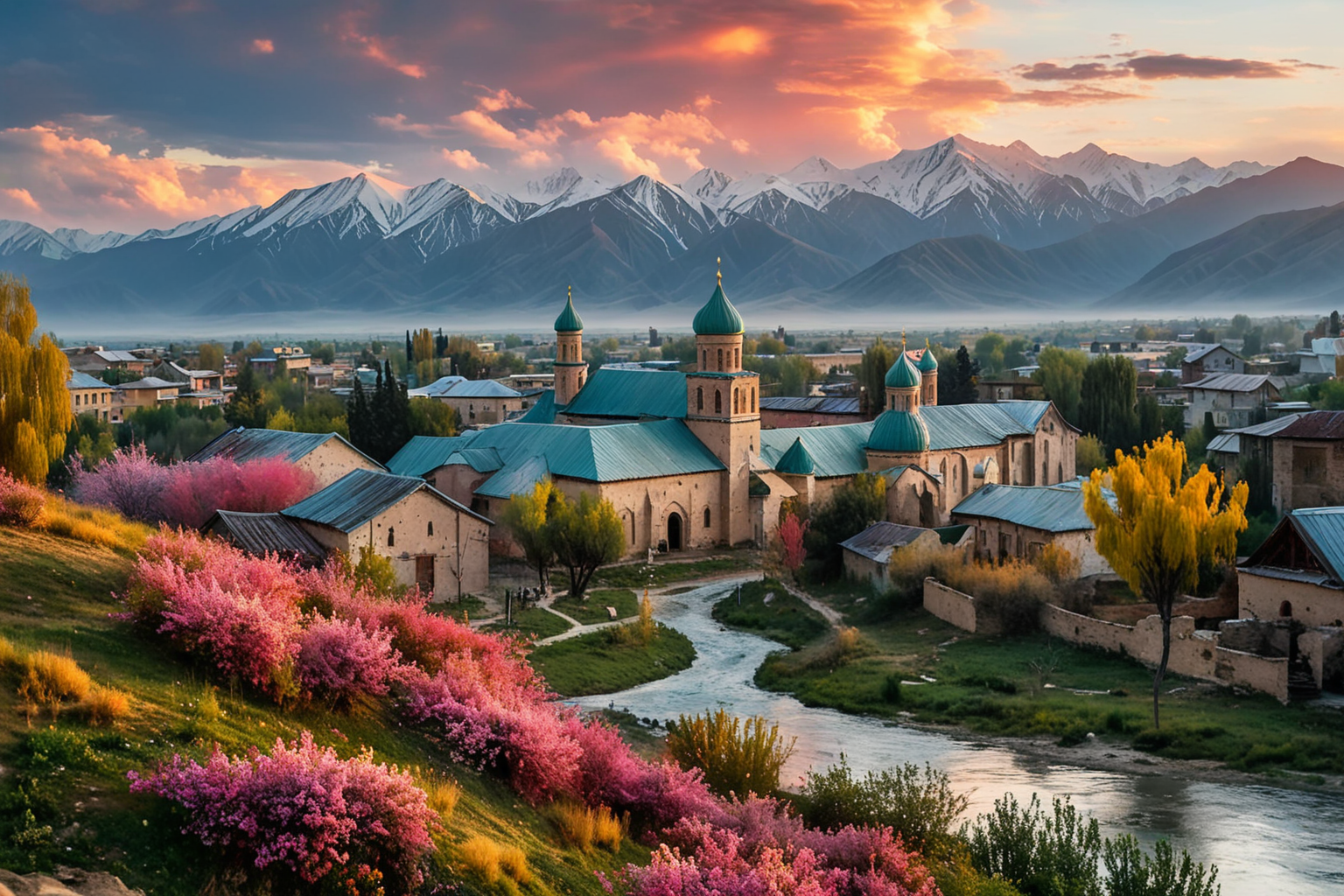 The picture takes place in Kyrgyzstan at dawn in the past with tsunami weather conditions. The cityscape is in Scribble Art technique inspired by Paul Cézanne, featuring chaotic brushstrokes and vibrant colors. In the foreground, a Dasiphora bush stands resilient against the winds, its pink blooms contrasted against the tumultuous sky. In the background, buildings with sloping roofs and geometric shapes are partially obscured by swirling water and mist, creating an otherworldly atmosphere. The city is bustling with activity despite the chaos, people walking amidst the debris, their faces illuminated by the first light of dawn.