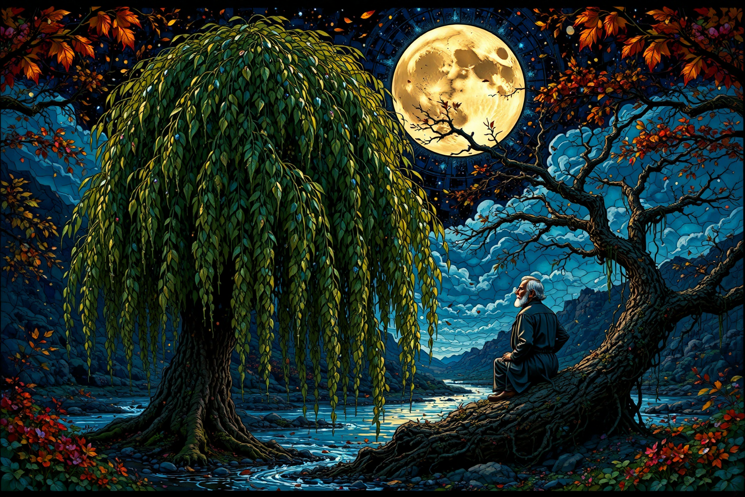 Alphonse Mucha style, Moon, night, weeping willow, secrets, branches, old man, life, endless fight, autumn, hue, youth, dreams, river, song, tales, lost gleams, ancient lore, dragons, skies, seasons, time, relentless sigh, silence, pale moon’s glow, thoughts, echo, willow, river, old man, contemplates, life, ebb, flow HD, sharp focus, stunningly beautiful, stained glass style, vibrant, beautiful, translucent, intricate, detailed