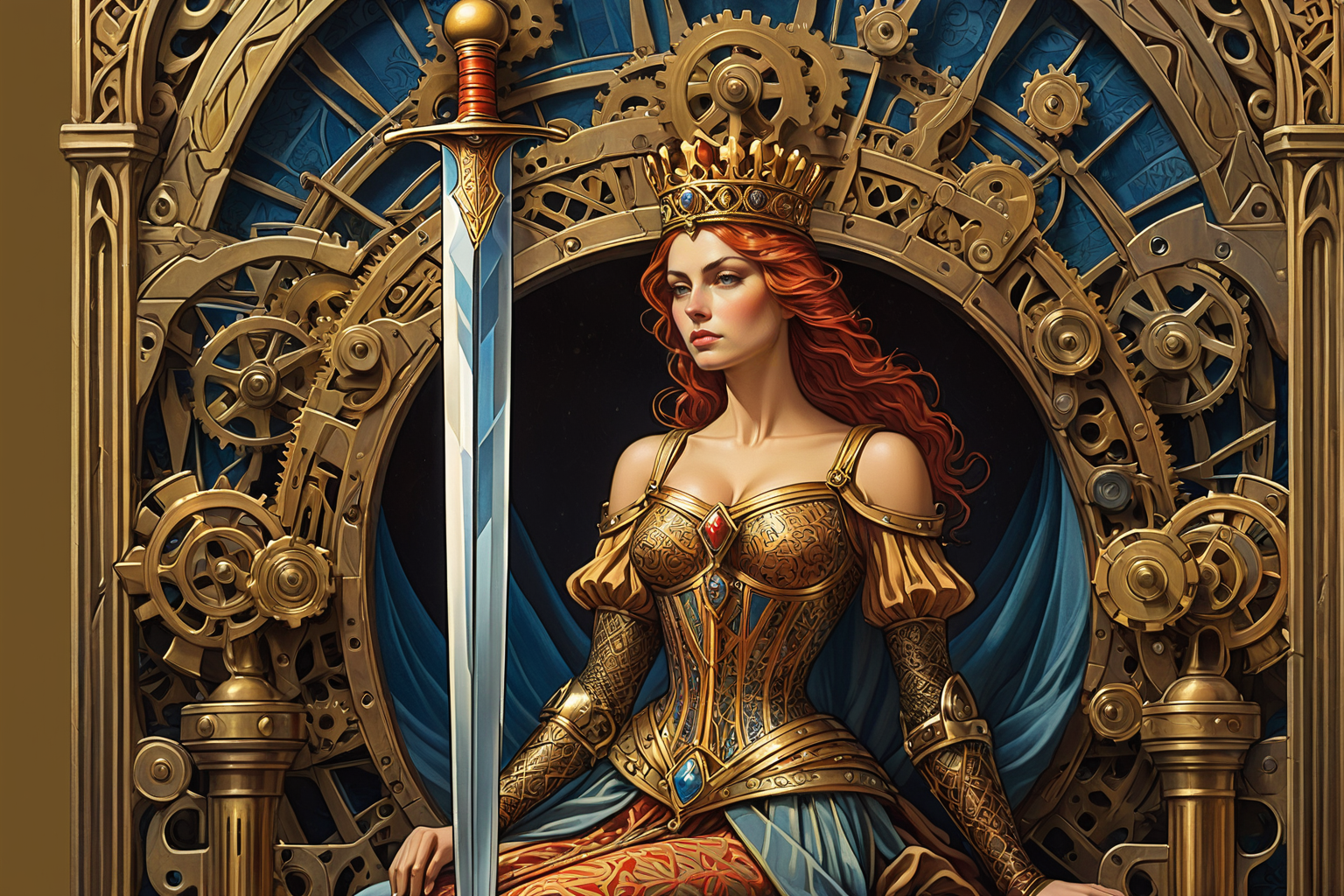 Queen of Swords Tarot card, Giacomo Balla style, * Intellectual strength * Ruthless honesty * Uncomfortable truths * Difficult choices * Avoidance * Lie * Situation * Revelations * Crucial decision * Confrontation * Conflict * Emotional outbursts * Logic and reason * Transformation * Illusions * Reality * Self-discovery HD, sharp focus, stunningly beautiful, steampunk style, antique, mechanical, brass and copper tones, gears, intricate, detailed