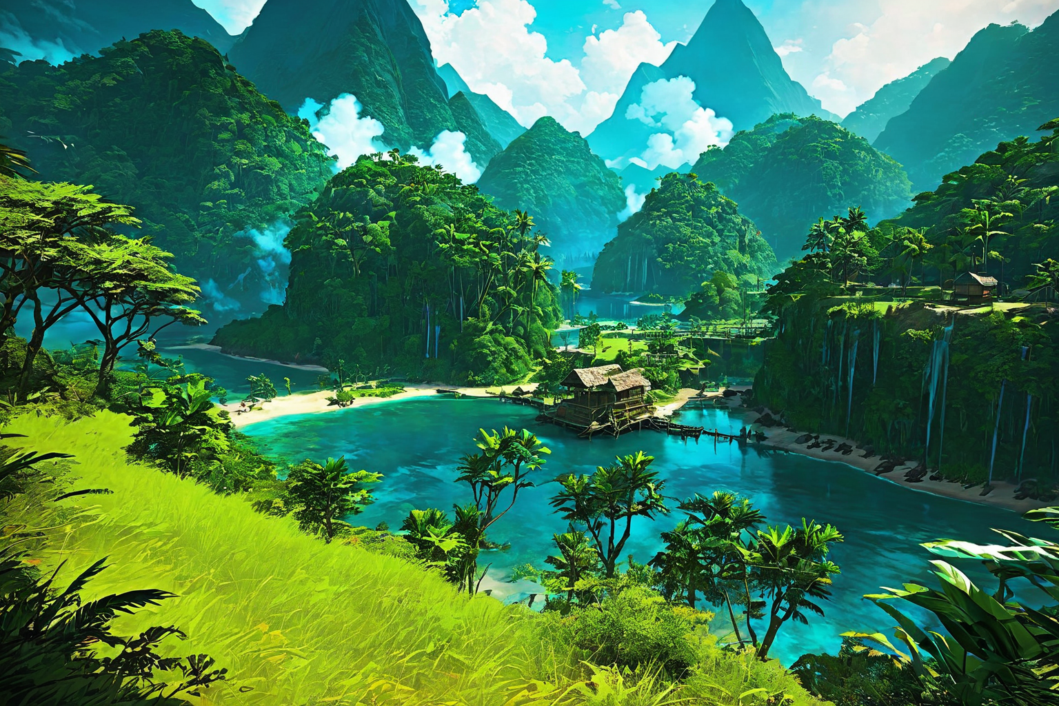 Game: Far Cry 3 (2012), Anatoly Osmolovsky style, Savage island, warlords, rebellious natives, wits, weaponry, dark secrets, brutal conflict, desperate fight, survival, world, appearance HD, sharp focus, stunningly beautiful, constructivist style, geometric shapes, bold colors, dynamic composition, propaganda art style