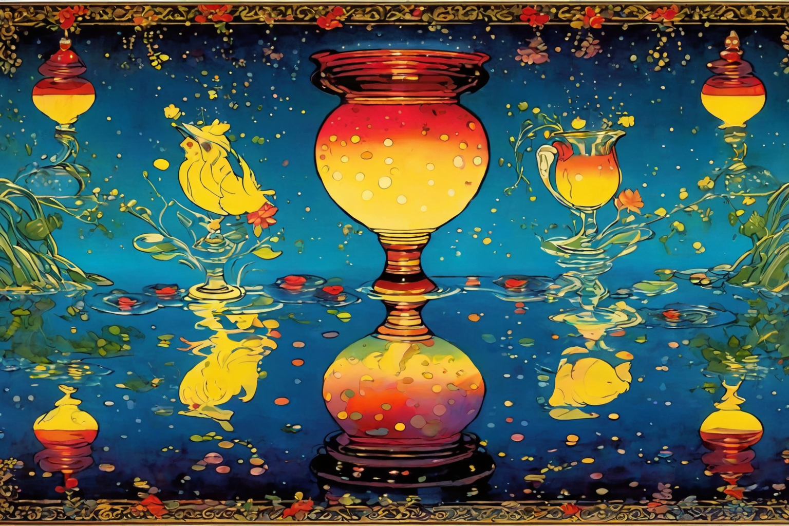 Nine of Cups Tarot card, Rembrandt style, Nine of Cups, happiness, fulfillment, joy, abundance, dreams, inner peace, contentment, satisfaction, pleasant surprises, well-being, unexpected benefits, balance, ambition, new challenges, complacency, growth, improvement, aspirations, successes HD, sharp focus, stunningly beautiful, pointillism style, composed entirely of small, distinct dots of color, vibrant, highly detailed
