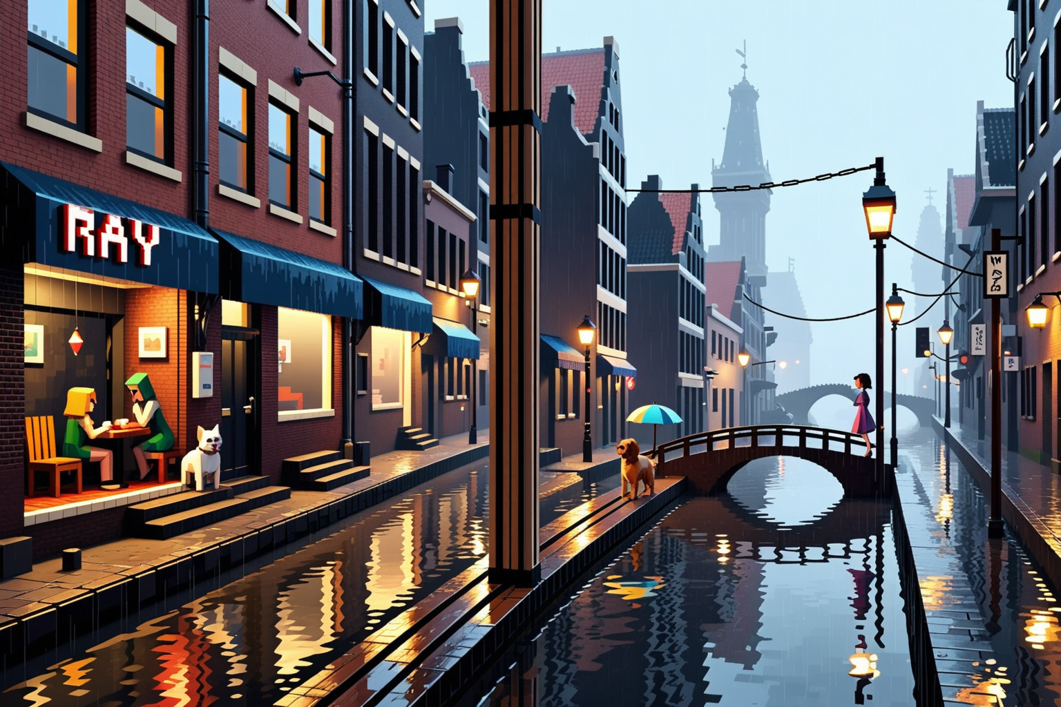 NSFW, Man Ray style, Futuristic canal, Netherlands, dusk, misty rain, city lights, woman, wooden pole, balance, small dog, tail, wag, commotion, rising waters HD, sharp focus, stunningly beautiful, pixel-art, low-res, blocky, pixel art style, 8-bit graphics