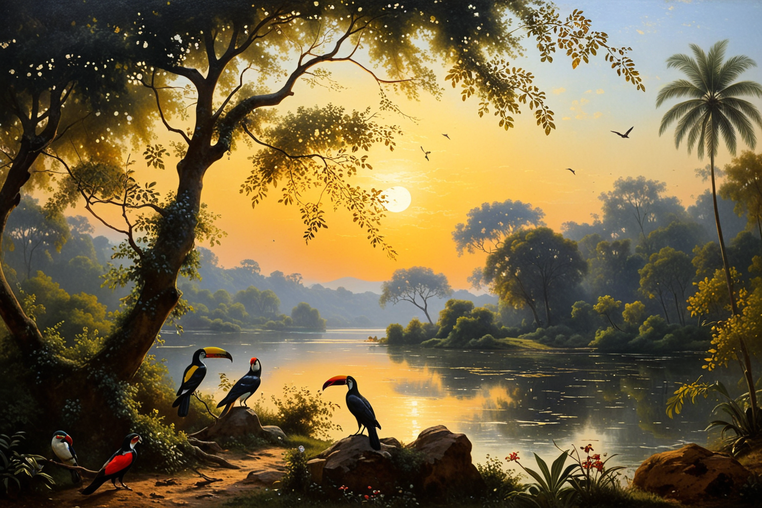 In the near future, Jamaica is enveloped in an eerie eclipse during the morning hours. The landscape is painted in the geometric abstractionism style of Nib Painting, reminiscent of artist Jean-Baptiste Camille Corot’s work. A solitary figure is strolling along a path, surrounded by vibrant flora and fauna including Prunus trees and exotic birds such as toucans and parrots. The atmosphere is calm yet mysterious, hinting at an otherworldly experience.