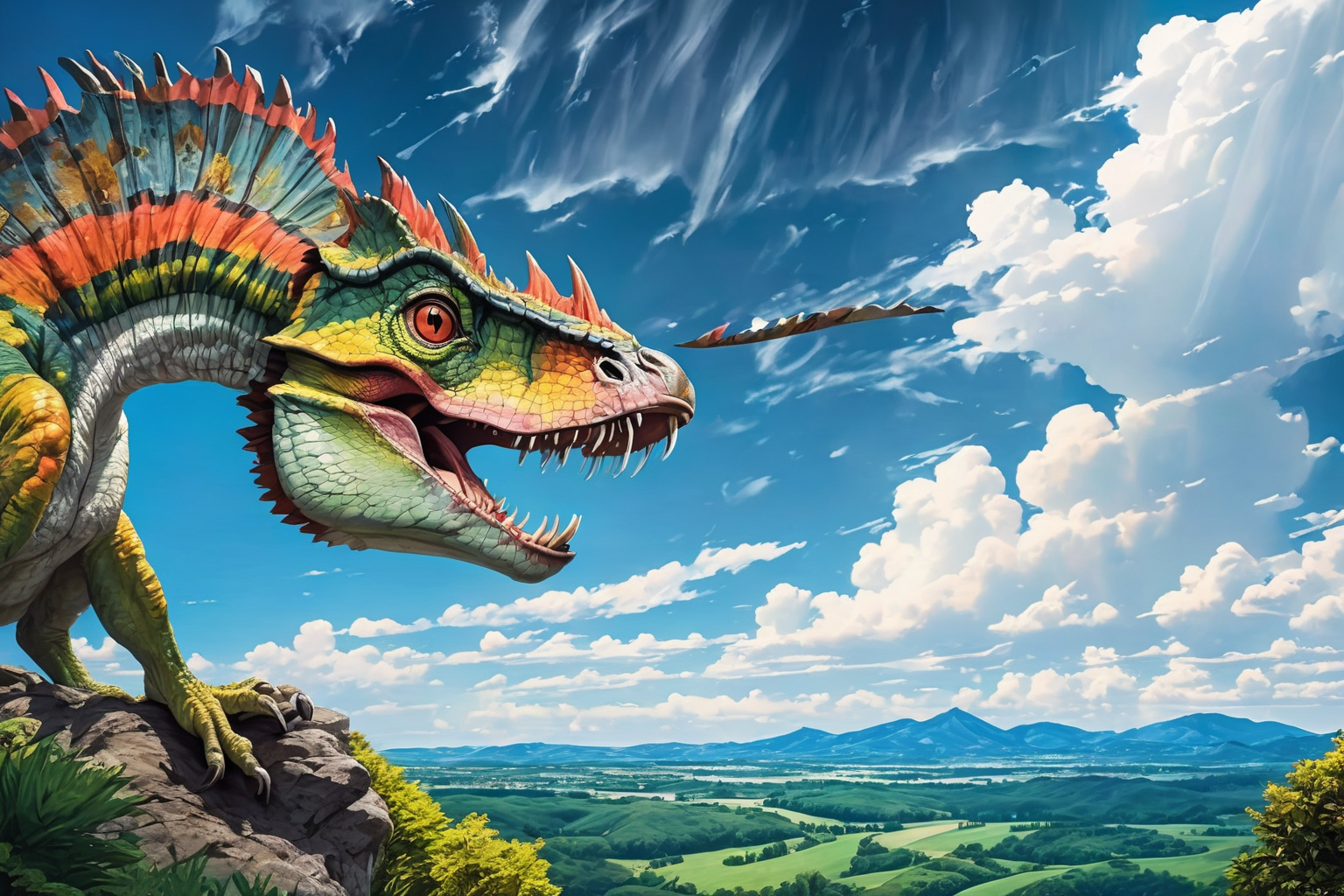 Dilophosaurus, Correggio style, HD, sharp focus, stunningly beautiful, long shot scenic professional photograph of perfect viewpoint, highly detailed, wide-angle lens, hyper realistic, with dramatic sky, polarizing filter, natural lighting, vivid colors, everything in sharp focus, HDR, UHD, 64K