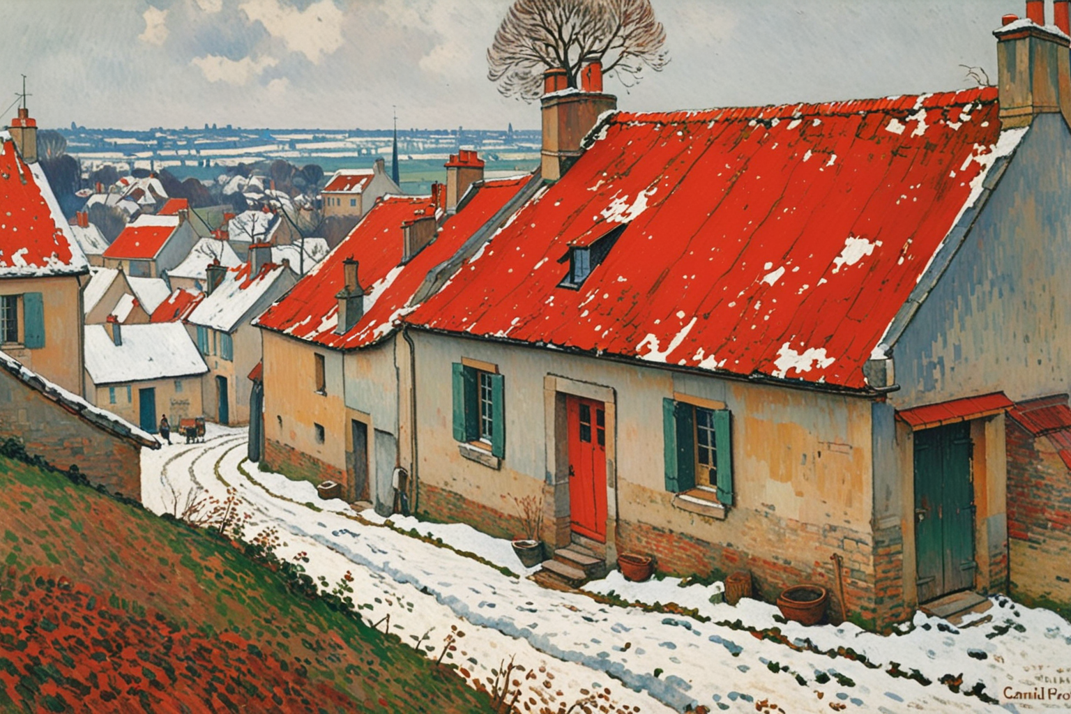 This is how the PixelAlchemy image generation model “sees” the “The Red Roofs, a Corner of a Village, Winter Effect” painting by Camille Pissarro.