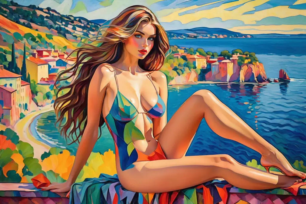 NSFW, young woman, beautiful face, great body, gorgeous figure, long legs, pretty eyes, long hair, great bust, beautiful background, magnificent scenery, Roy Lichtenstein style, HD, sharp focus, stunningly beautiful, Fauvism Art, painterly, bold colors, textured brushwork, fauvism art