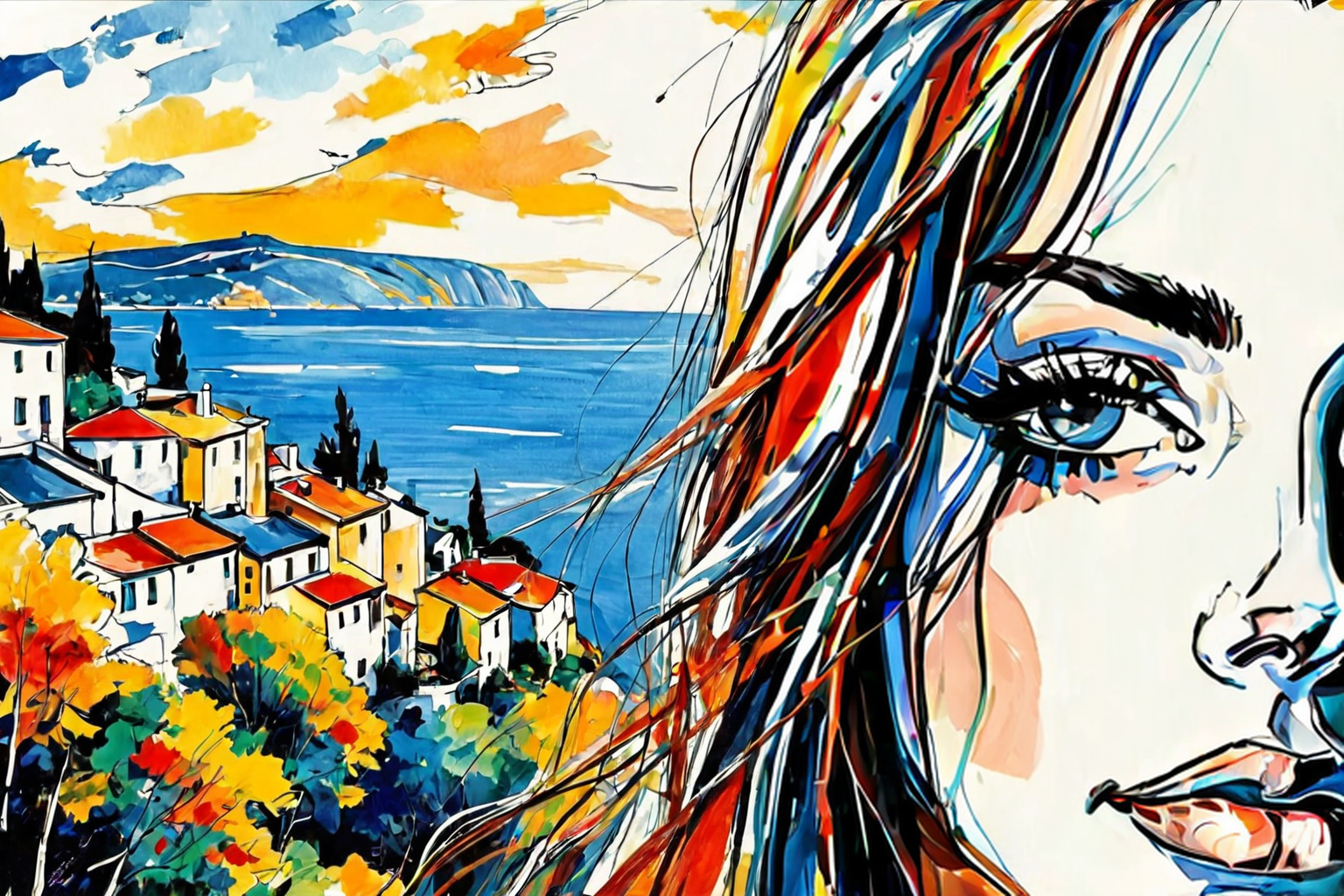 young woman, beautiful face, standing, great body, gorgeous figure, long legs, pretty eyes, long hair, TA-Linux Linux distribution style, beautiful background, magnificent scenery, Maurice de Vlaminck style, HD, sharp focus, stunningly beautiful, Marker Drawing, bold marker lines, visibile paper texture, marker drawing