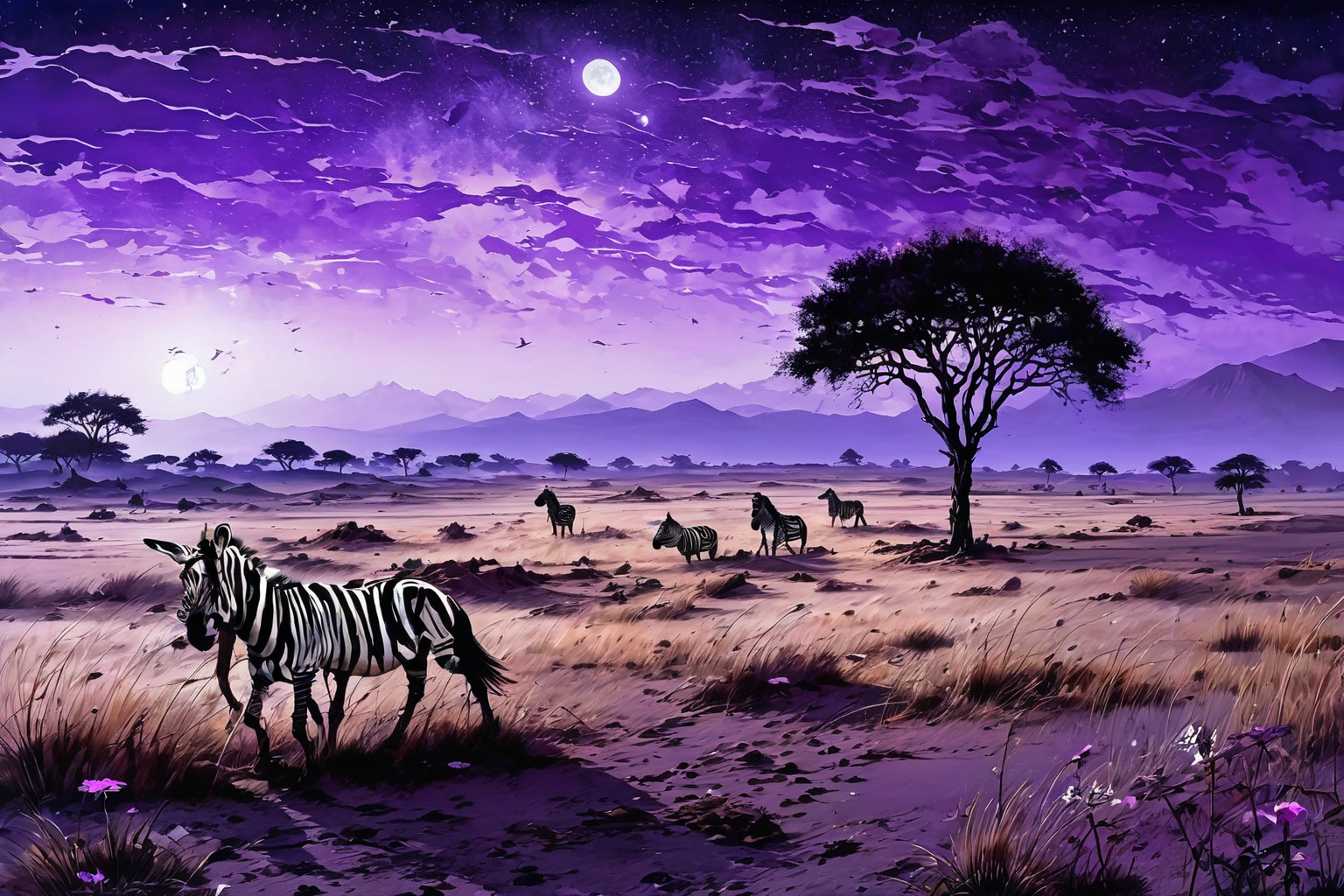 A nocturnal scene in Benin during a recent drought, depicted in the classicist style of Alexander Ivanov using spray painting. In the canvas, a lone figure stands amidst parched earth and skeletal tree branches, gazing towards a distant horizon lit by a pale moon. A small herd of dehydrated zebras grazes nearby, their silhouettes stark against the arid landscape. In the foreground, a vibrant Clematis flower blooms defiantly, its purple petals contrasting with the dusty tones of the surroundings. The overall composition captures the resilience of nature and the beauty that can persist even in harsh conditions.