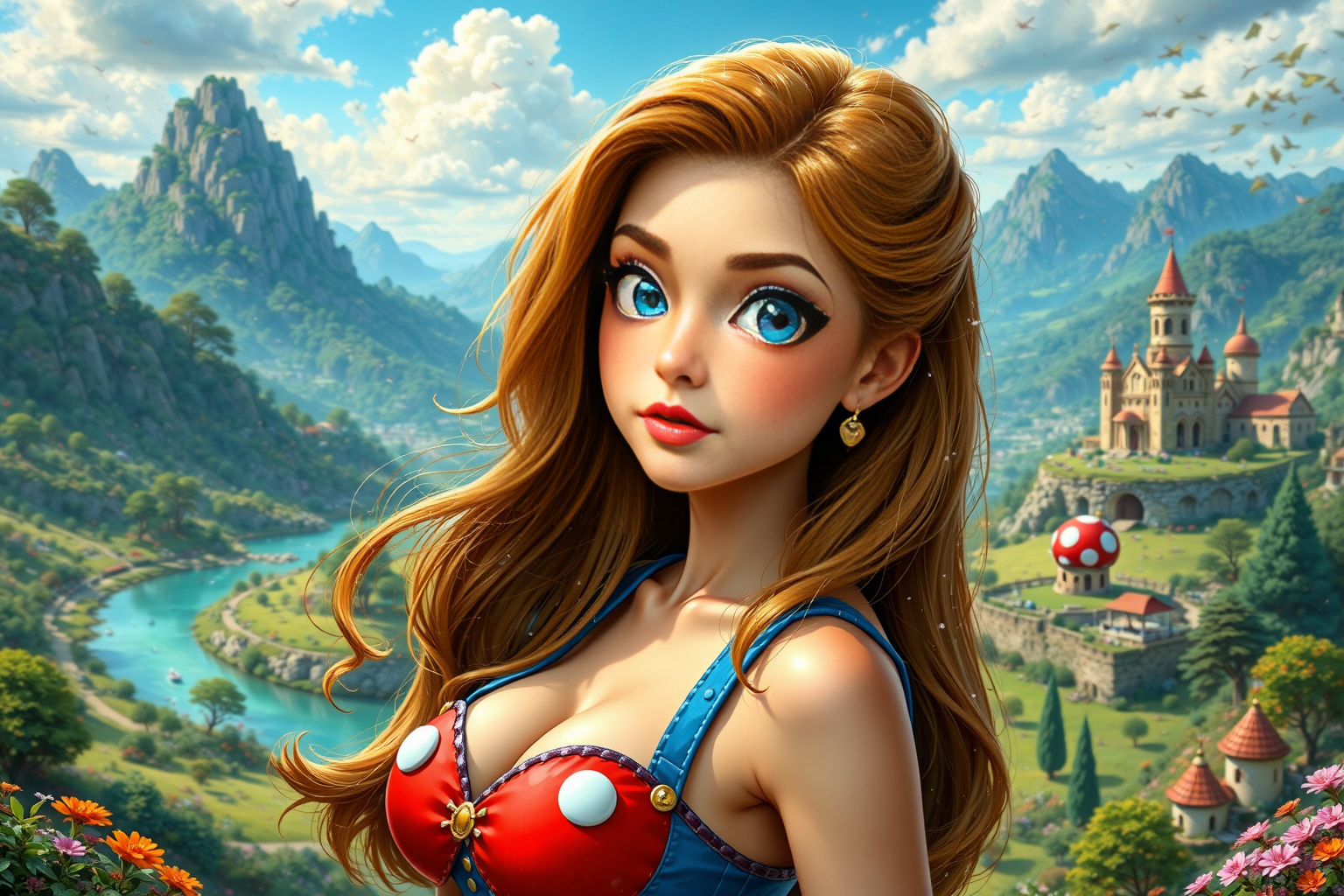 young woman, beautiful face, great body, gorgeous figure, long legs, pretty eyes, long hair, great bust, beautiful background, magnificent scenery, Jasper Johns style, HD, sharp focus, stunningly beautiful, Super Mario style, vibrant, cute, cartoony, fantasy, playful, reminiscent of Super Mario series