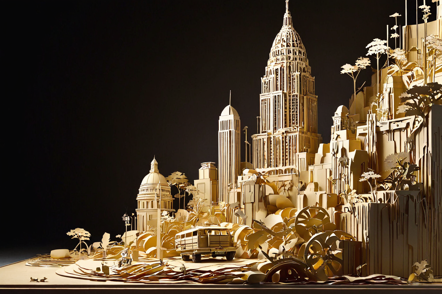 Movie: Wanted (2008), Claes Oldenburg style, Mark Millar, J.G Jones, comic book series, Wanted, Brad Pitt, movie title, box office success, worldwide grossing, elaborate action sequences, slow-motion, stylized gunfights, Bobby Hart, low-level insurance adjuster, secret society, assassins HD, sharp focus, stunningly beautiful, thick layered papercut art of, deep 3D, volumetric, dimensional, depth, thick paper, high stack, heavy texture, tangible layers