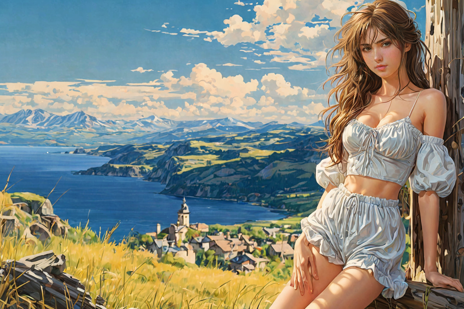 young woman, beautiful face, great body, gorgeous figure, long legs, pretty eyes, long hair, great bust, beautiful background, magnificent scenery, Valentin Serov style, HD, sharp focus, stunningly beautiful, anime artwork, anime style, key visual, vibrant, studio anime, highly detailed