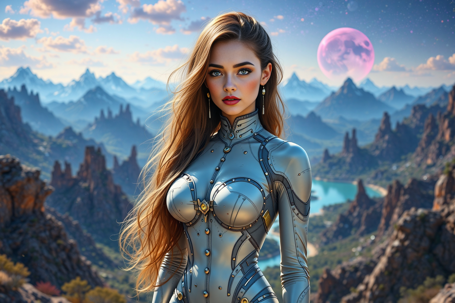 young woman, beautiful face, standing, great body, gorgeous figure, long legs, pretty eyes, long hair, learns Dylan programming language, beautiful background, magnificent scenery, Erik Bulatov style, HD, sharp focus, stunningly beautiful, sci-fi style, futuristic, technological, alien worlds, space themes, advanced civilizations