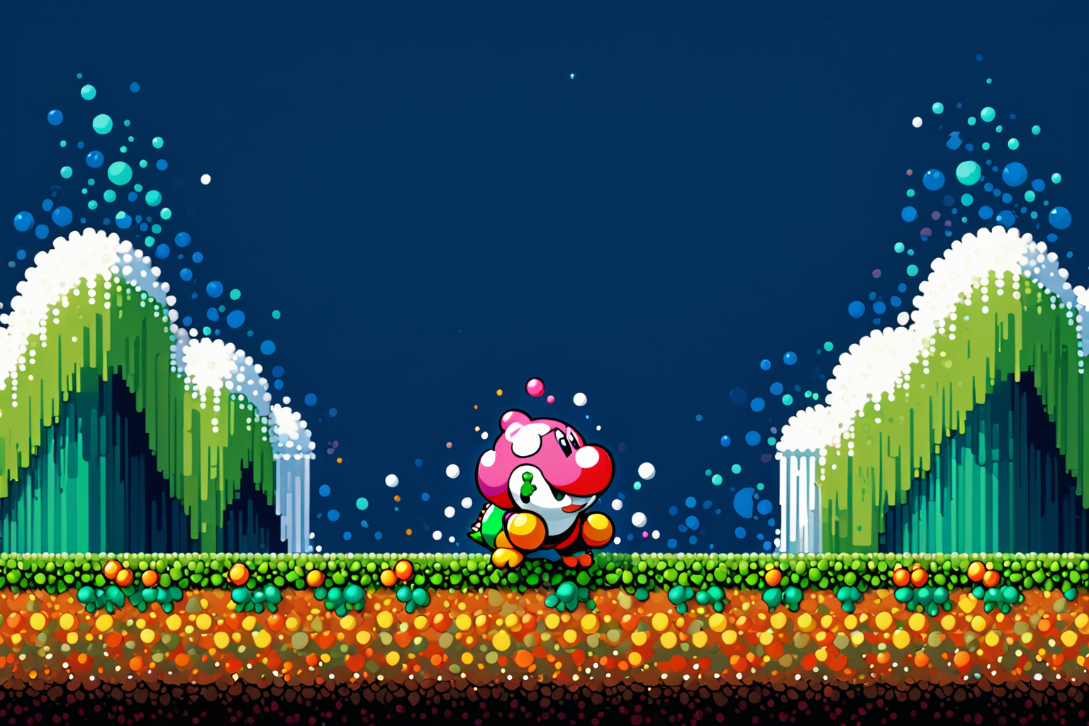 pucker, Honoré Daumier style, HD, sharp focus, stunningly beautiful, Bubble Bobble style, 8-bit, cute, pixelated, fantasy, vibrant, reminiscent of Bubble Bobble game