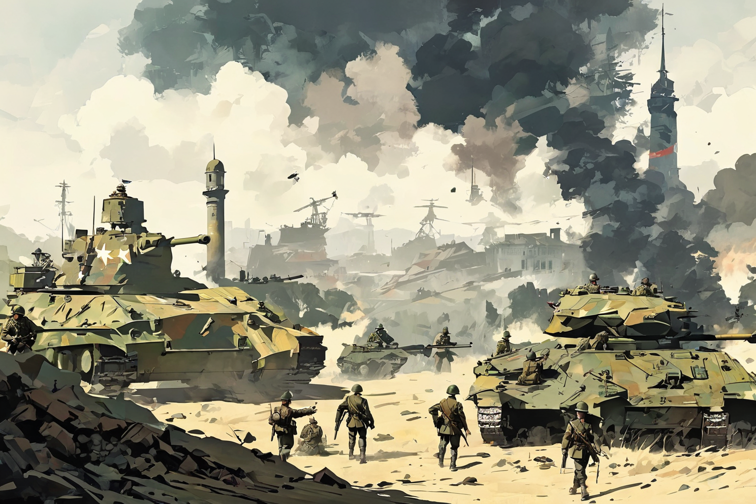 Game: Company of Heroes (2006), Eugène Delacroix style, Company of Heroes (2006), World War II, squad, strategy, landscapes, enemies, history, decision, tactical warfare, terrain, buildings, cover, attack HD, sharp focus, stunningly beautiful, papercut collage of, mixed media, textured paper, overlapping, asymmetrical, abstract, vibrant