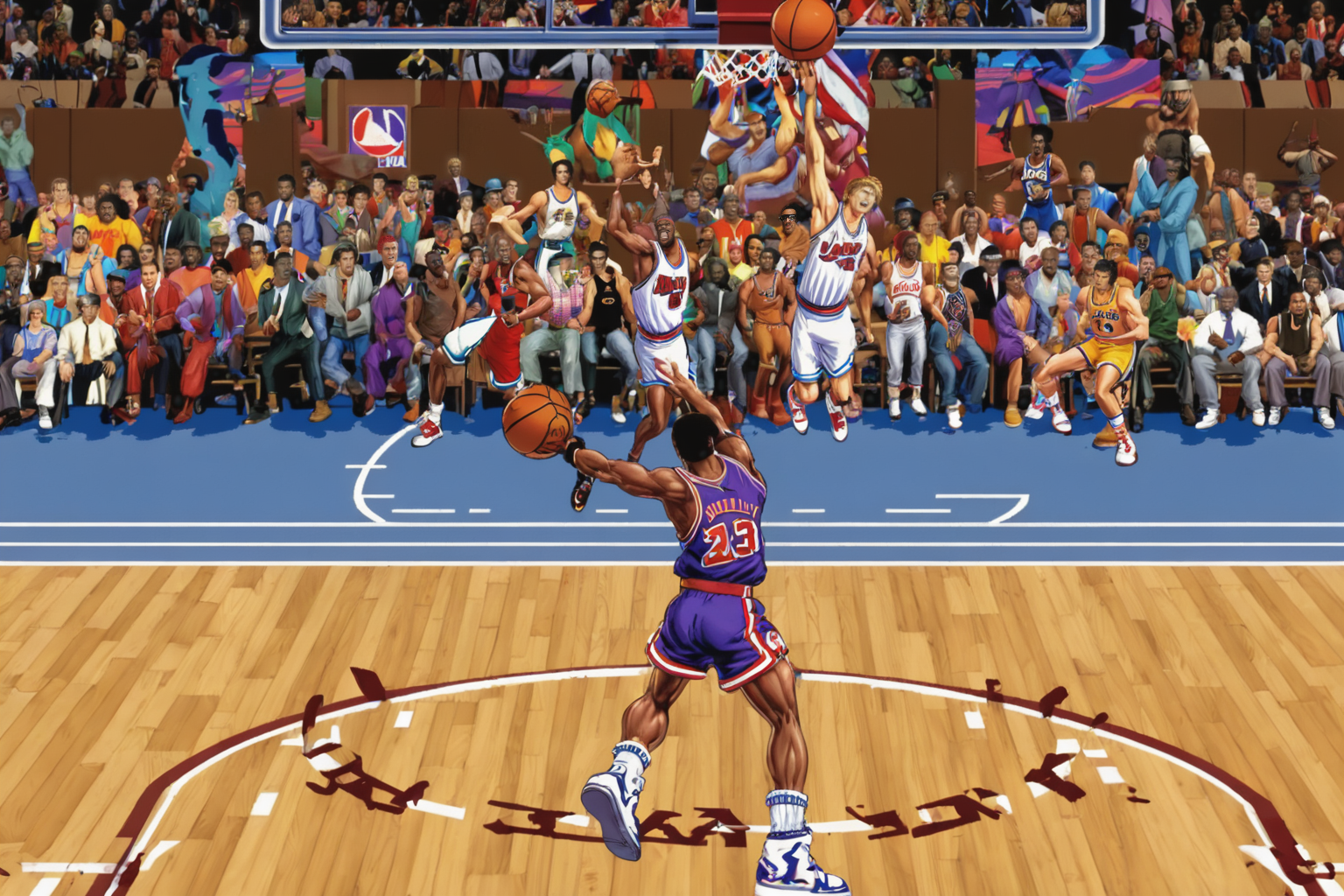 Game: NBA Jam (1993), Andrei Rublev style, NBA Jam (1993), Midway, fast-paced action, exaggerated gameplay, iconic, arcade game, popular. HD, sharp focus, stunningly beautiful, GTA-style artwork, satirical, exaggerated, pop art style, vibrant colors, iconic characters, action-packed