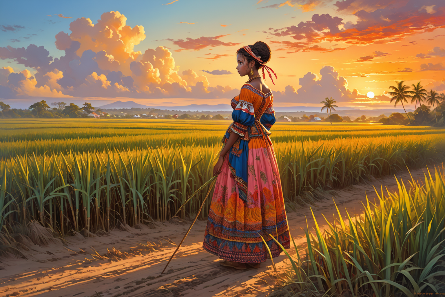 Create a captivating portrait set in the vibrant scene of Barbados at sunset, circa late 19th century. The canvas captures a moment of tranquility as a beautiful, local woman stands amidst swaying sugar cane fields. Dressed in traditional attire, she gazes contemplatively towards the horizon, where the sun paints the sky with hues of orange and pink. Clouds, partially veiling the sun, add depth to the scene. Incorporate the distinctive Kalamkari painting technique, characterized by bold outlines and intricate patterns, as seen in the artist Konstantin Makovsky’s work. In the foreground, a pair of curious locusts perched on a cane stalk adds a whimsical touch to this nostalgic portrait.