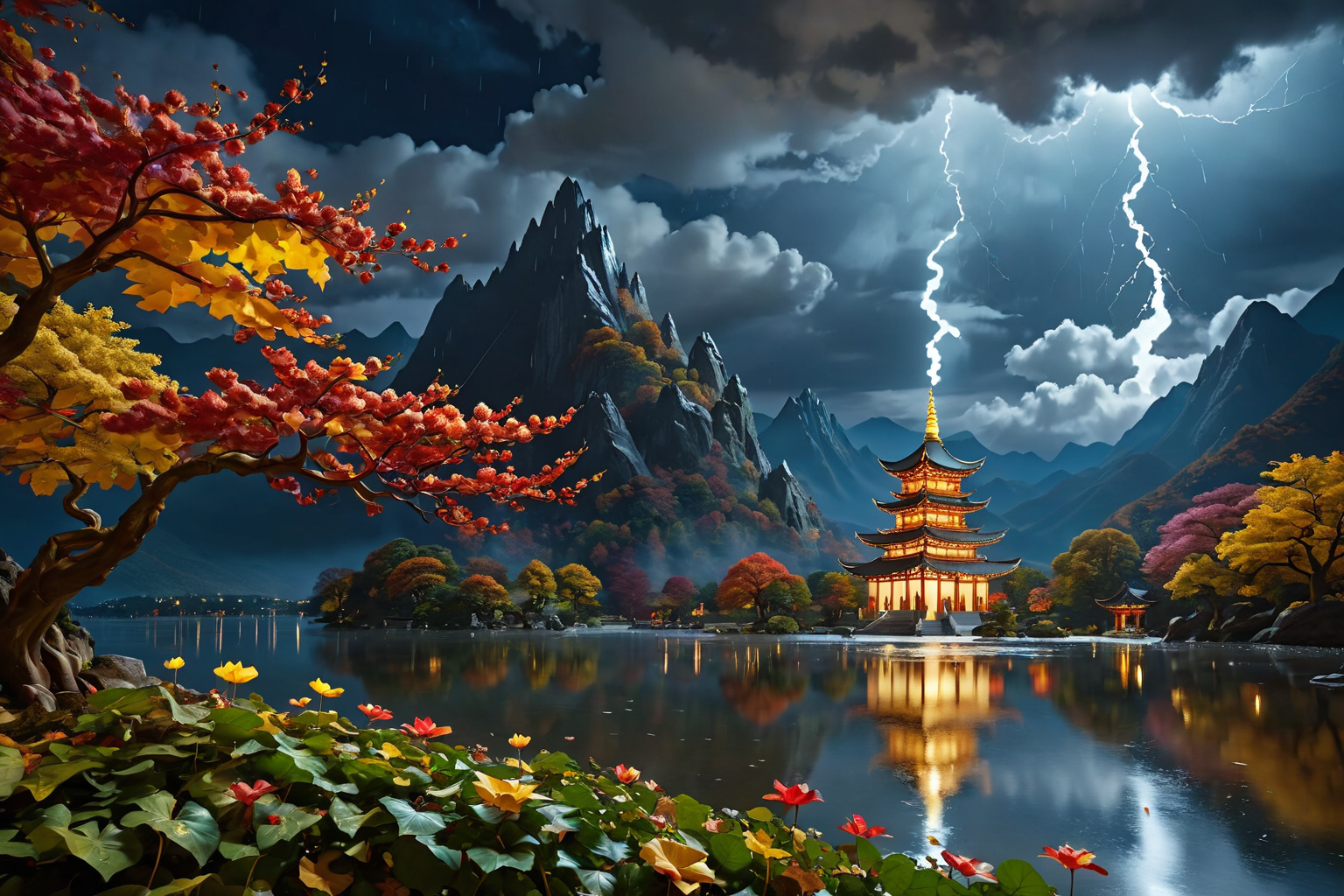 Claes Oldenburg style, Lake, temple, moonlight, dragon, river, mountains, rain, clouds, wind, people, gods, dream, flowers, autumn leaves, spirits HD, sharp focus, stunningly beautiful, Volumetric Lighting, light depth, dramatic atmospheric lighting, Volumetric Lighting