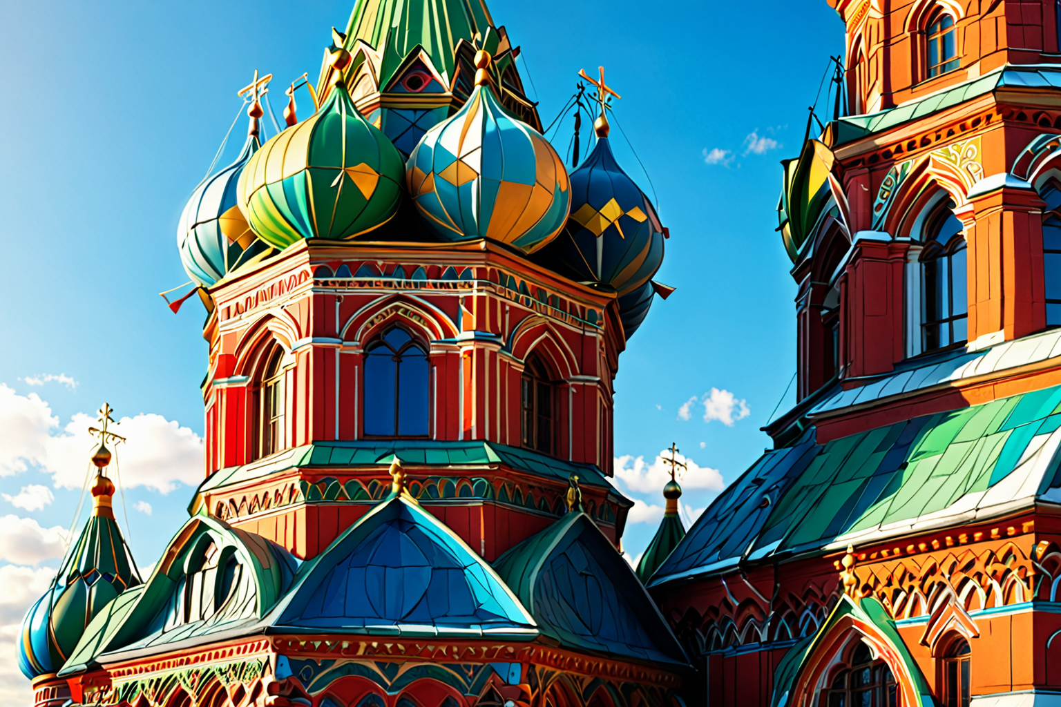 Saint Basil’s Cathedral Moscow, William Baziotes style, Saint Basil’s Cathedral, Moscow, vibrant domes, sunlight, azure sky, intricate design, colorful, Russian Orthodox artistry, fairytale charm. HD, sharp focus, stunningly beautiful, Ornate and Intricate, decorative, highly detailed, elaborate, ornate, intricate