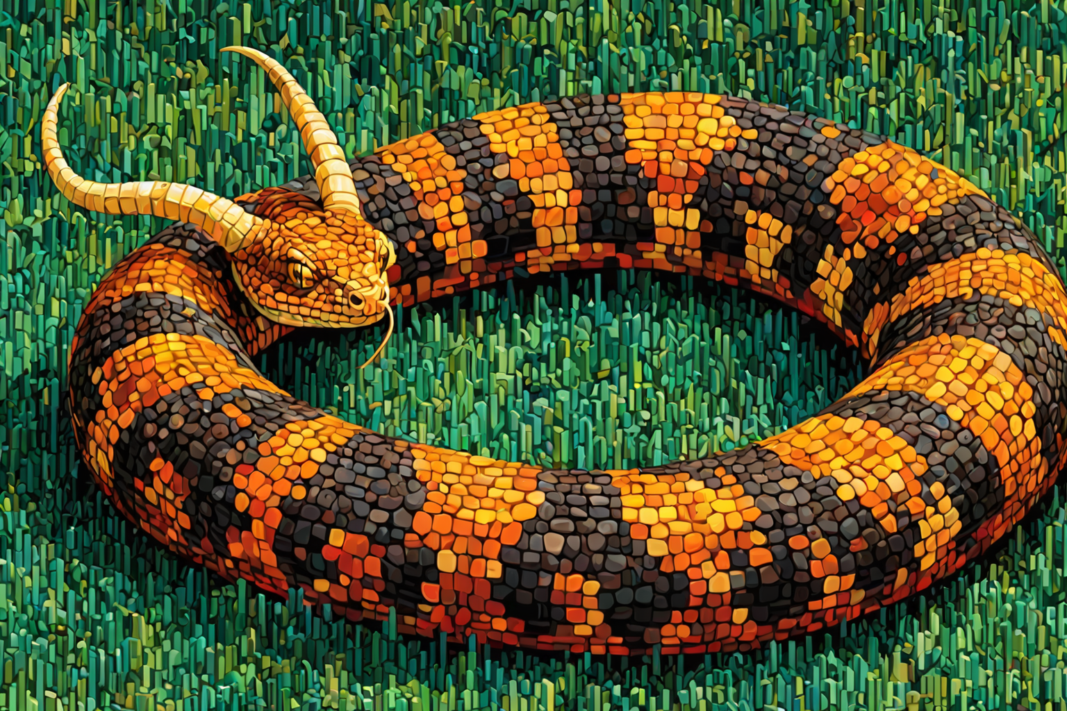 Horned Adder, Paul Gauguin style, HD, sharp focus, stunningly beautiful, pixel-art, low-res, blocky, pixel art style, 8-bit graphics