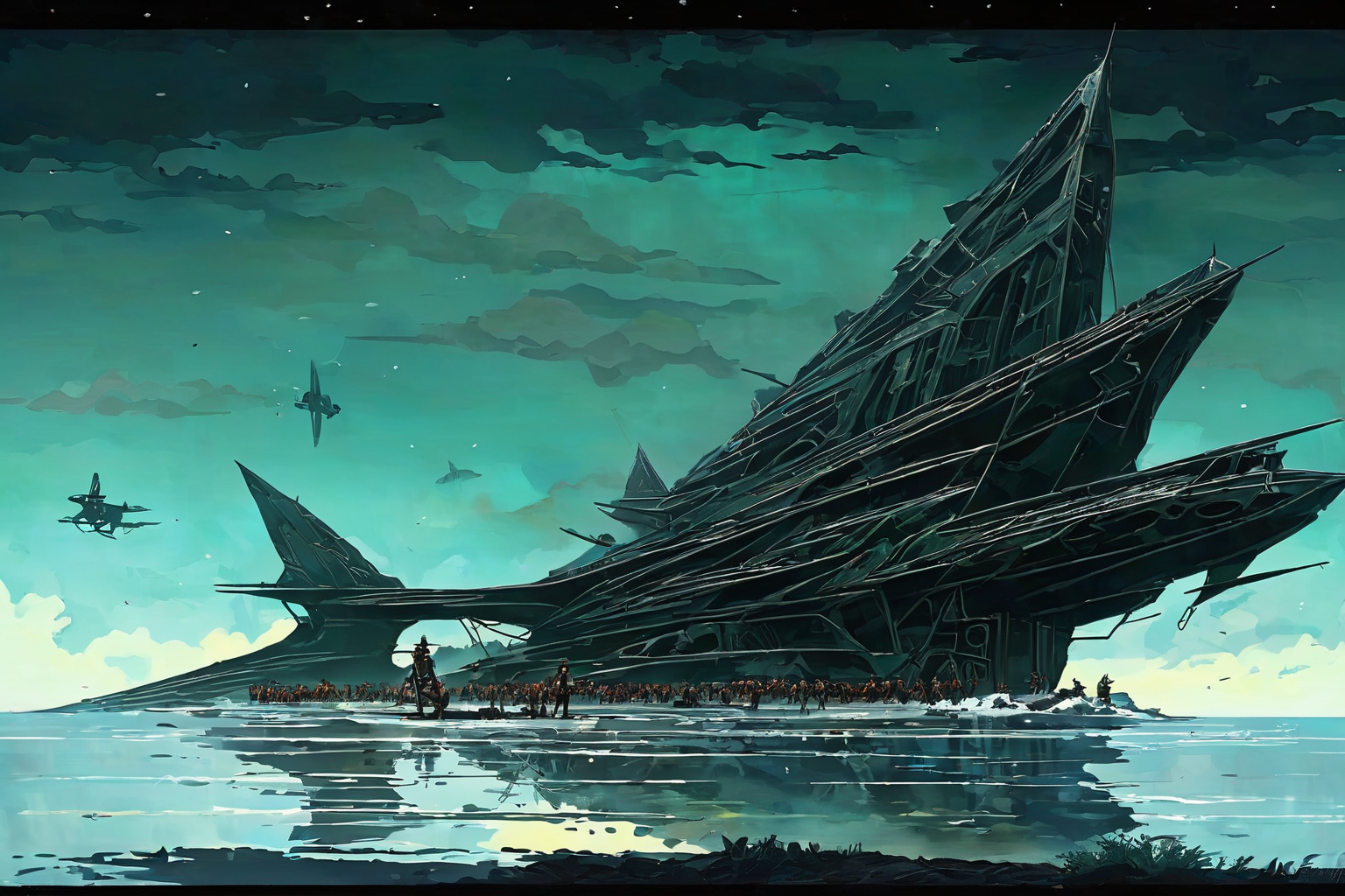 Game: Giants: Citizen Kabuto (2000), Georges Rouault style, Giants Citizen Kabuto (2000), colossal creatures, stranded spaceship crew, warring island civilization – Sea Reapers, Meccs, monstrous Kabuto, unintended consequences, desperate struggle for survival on a forgotten world. HD, sharp focus, stunningly beautiful, Surrealism, expressive, dramatic, organic lines and forms, dreamlike and mysterious, Surrealism