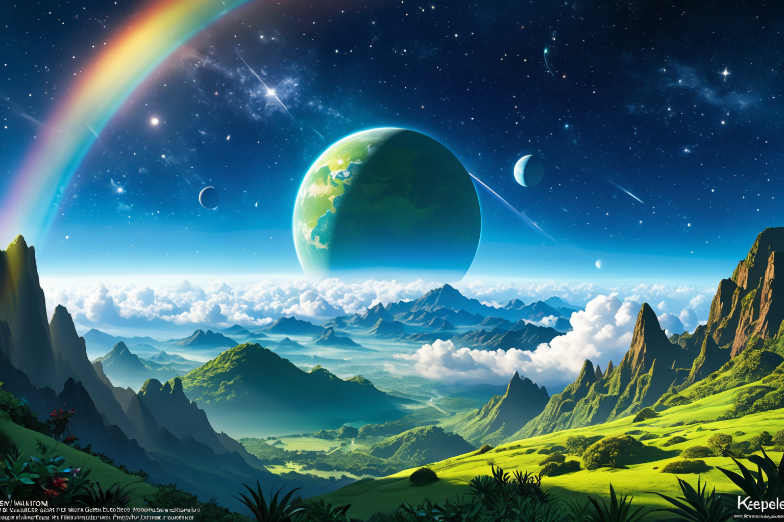 🌞Here is the today’s weather for Kepler-913b, a planet circling the magnificent Kepler-913 star. At this faraway location, it’s an unusual sight: the day is filled with a swirling sky of luminous blue and green hues. The unique atmosphere creates a surreal landscape with massive rainbow clouds, illuminated by the warm glow of two moons.