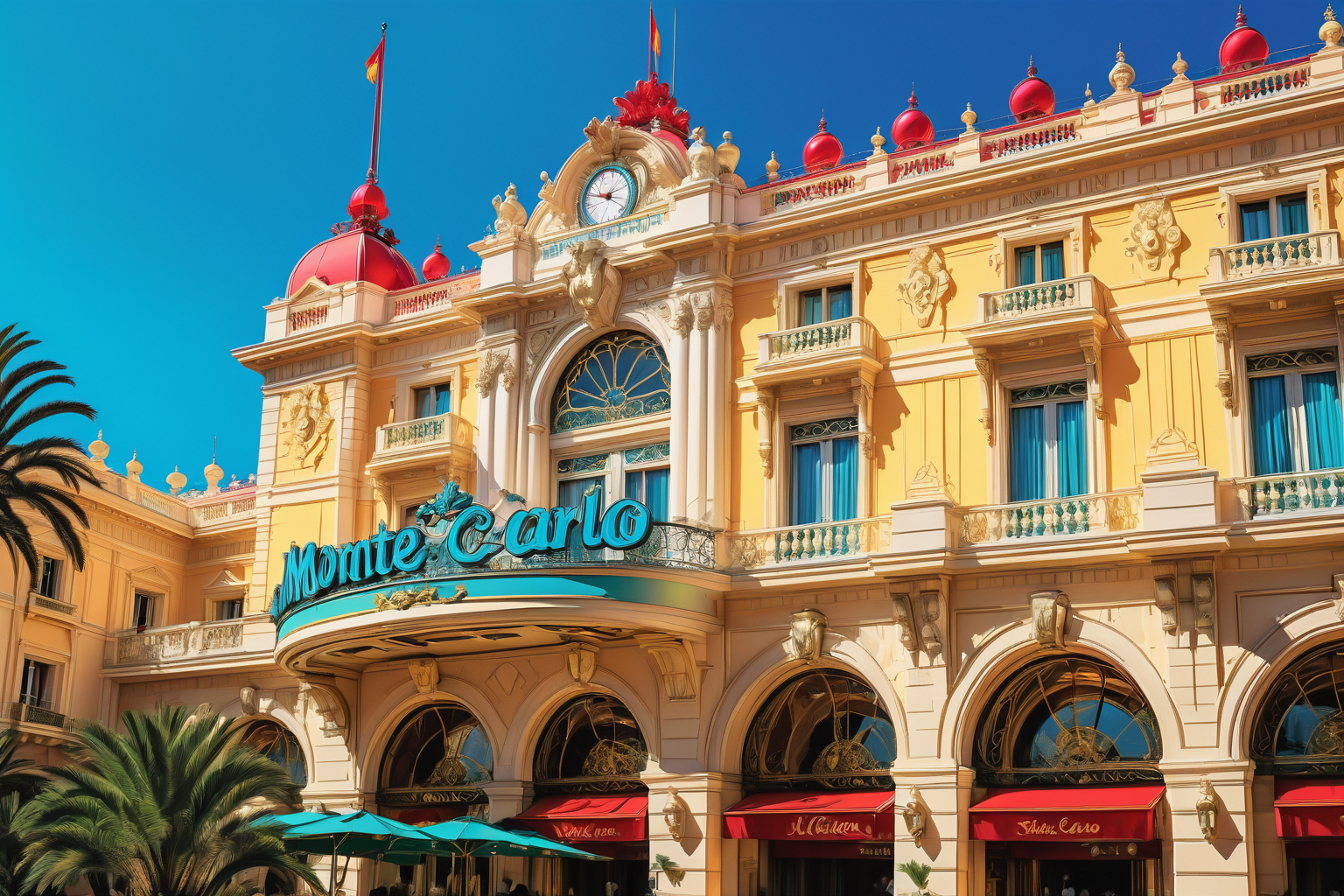 NSFW, Monte Carlo Casino Monaco, Grisha Bruskin style, Monte Carlo Casino, Monaco, visit, exhilaration, opulence, energy, visual feast HD, sharp focus, stunningly beautiful, Pop Art, vivid colors, flat color, 2D, strong lines, Pop Art