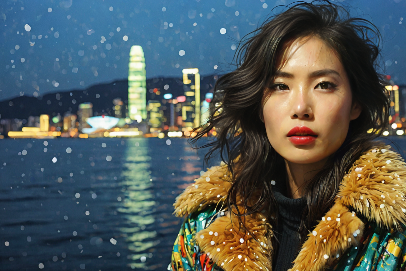 Andy Warhol style, South Korea, night, millennium turn, cold weather, icebergs, coastline, vibrant airbrushing, Impasto technique, Andy Warhol’s style, woman, fur coat, icy landscape, reflection distortion, cityscape, modern skyscrapers, neon lights, polar bear, surrealism, Feijoa plants, bold colors, texture, beauty, starkness, unique setting. HD, sharp focus, stunningly beautiful, isometric style, vibrant, beautiful, crisp, detailed, ultra detailed, intricate