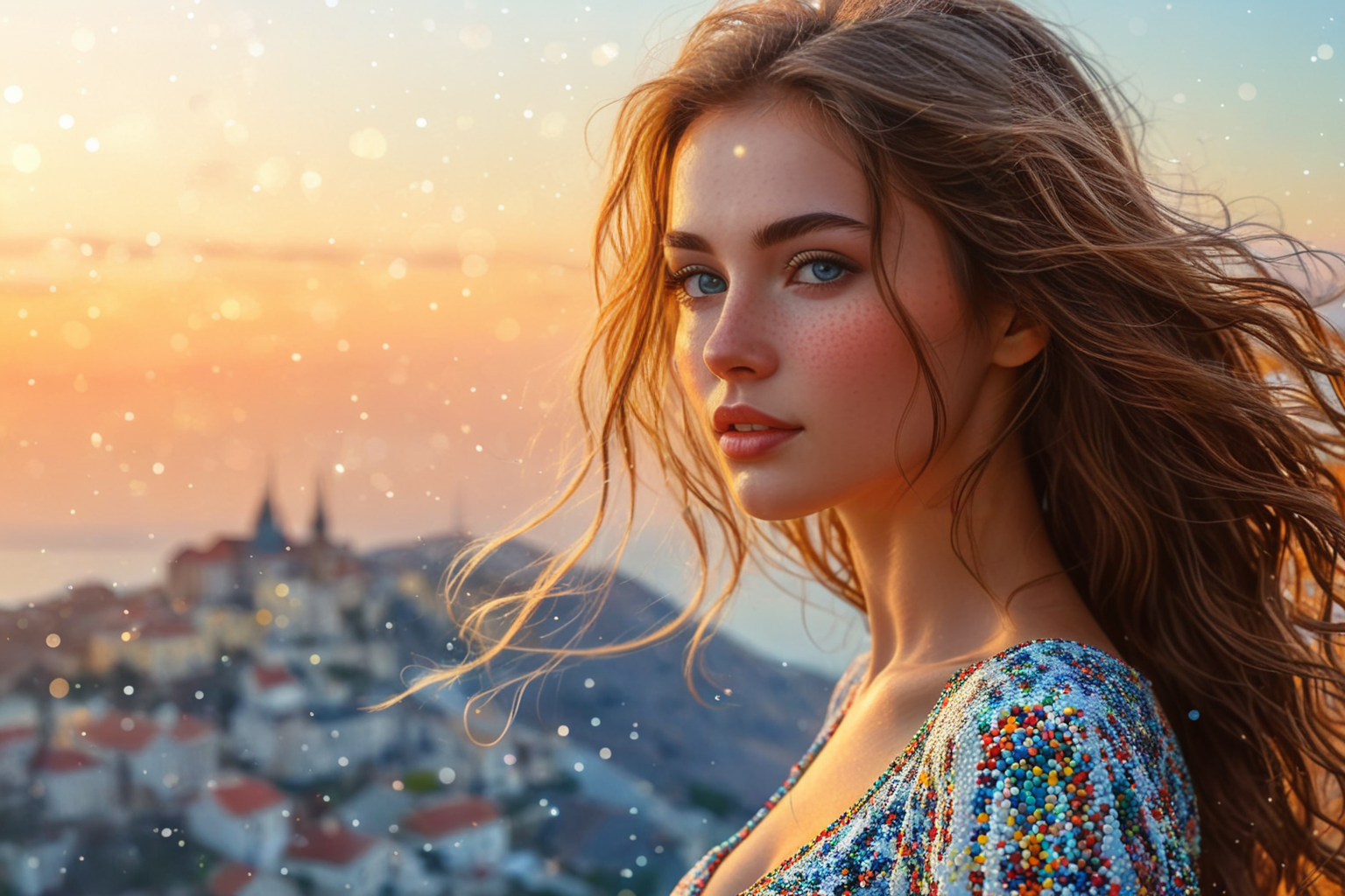 young woman, beautiful face, great body, gorgeous figure, long legs, pretty eyes, long hair, great bust, beautiful background, magnificent scenery, Nikolai Ge style, HD, sharp focus, stunningly beautiful, pointillism style, composed entirely of small, distinct dots of color, vibrant, highly detailed