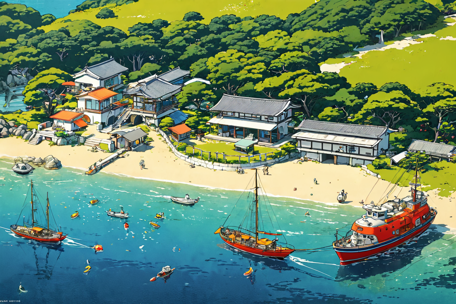 Naoshima Island Japan, Fernand Léger style, Naoshima Island, Japan, unique art installations, natural beauty, magical adventure, unforgettable experience, memories, years to come HD, sharp focus, stunningly beautiful, (Studio ghibli style, Art by Hayao Miyazaki:1,2), Anime Style, Manga Style, Hand drawn, cinematic, Sharp focus, humorous illustration, big depth of field, Masterpiece, concept art, trending on artstation, Vivid colors, Simplified style, trending on ArtStation, trending on CGSociety, Intricate, Vibrant colors, Soft Shading, Simplistic Features, Sharp Angles, Playful