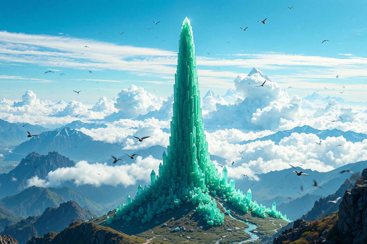 KOI 4943.01 exoplanet, Olga Chernysheva style, Weather, Veridian Spire, KOI 4943.01, temperature, breeze, light, scattered, high-altitude cirrus clouds, landscape, shimmering effect, atmospheric pressure, visibility, excellent, kilometers, fact, incredibly tall, silica-rich crystal formations, region, vibrant green hue, name HD, sharp focus, stunningly beautiful, Luxurious Elegance, extravagant, ornate, designer, opulent, picturesque, lavish