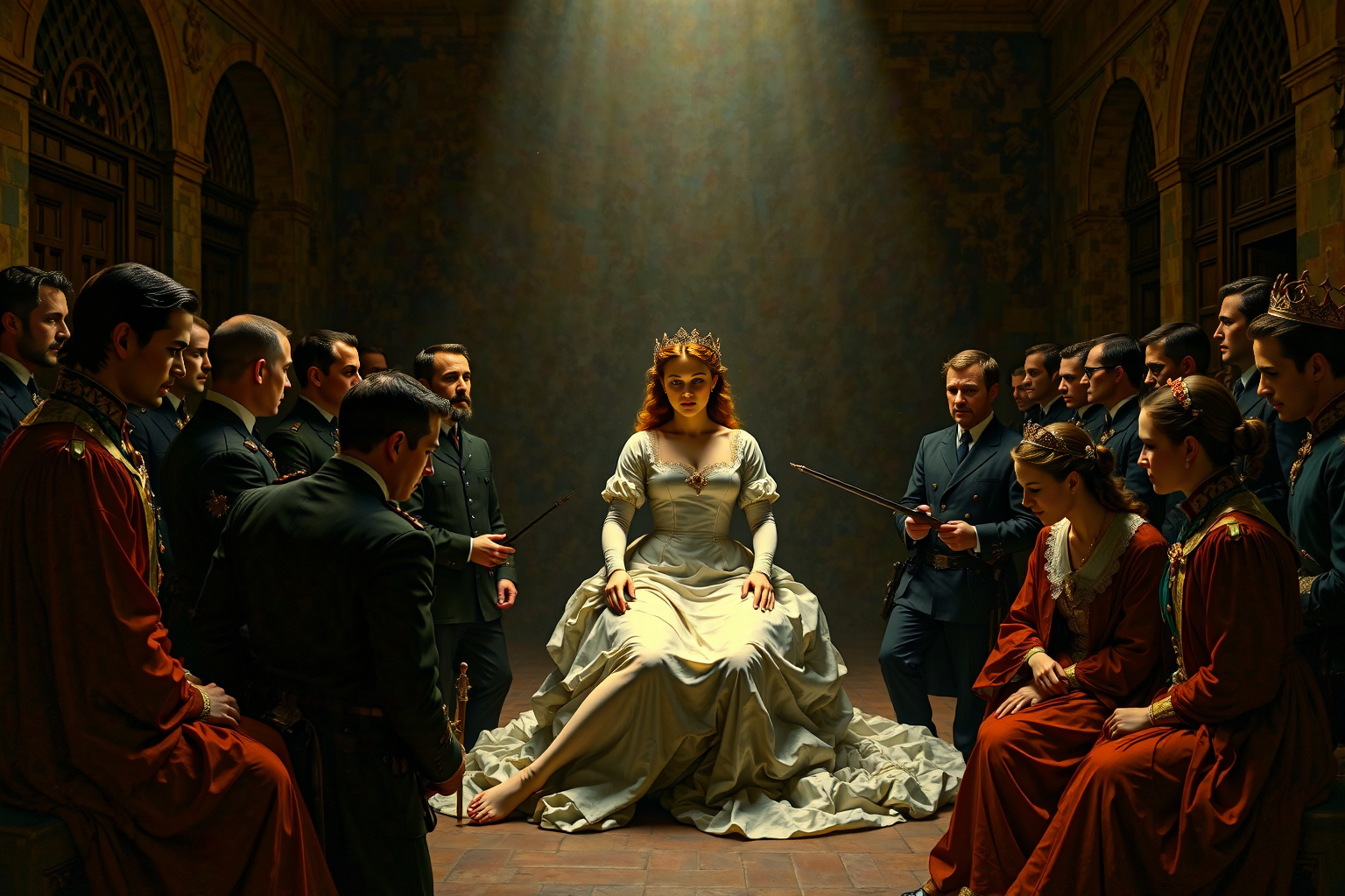 “The Execution of Lady Jane Grey” is a historical oil on canvas painting by French artist Paul Delaroche, created in 1833. The work depicts the supposed last moments of Lady Jane Grey, who was Queen of England for just nine days before being executed in 1554. The painting is known for its dramatic and emotive portrayal of the young queen’s final moments, with her surrounded by executioners and nobles in a dimly lit chamber.