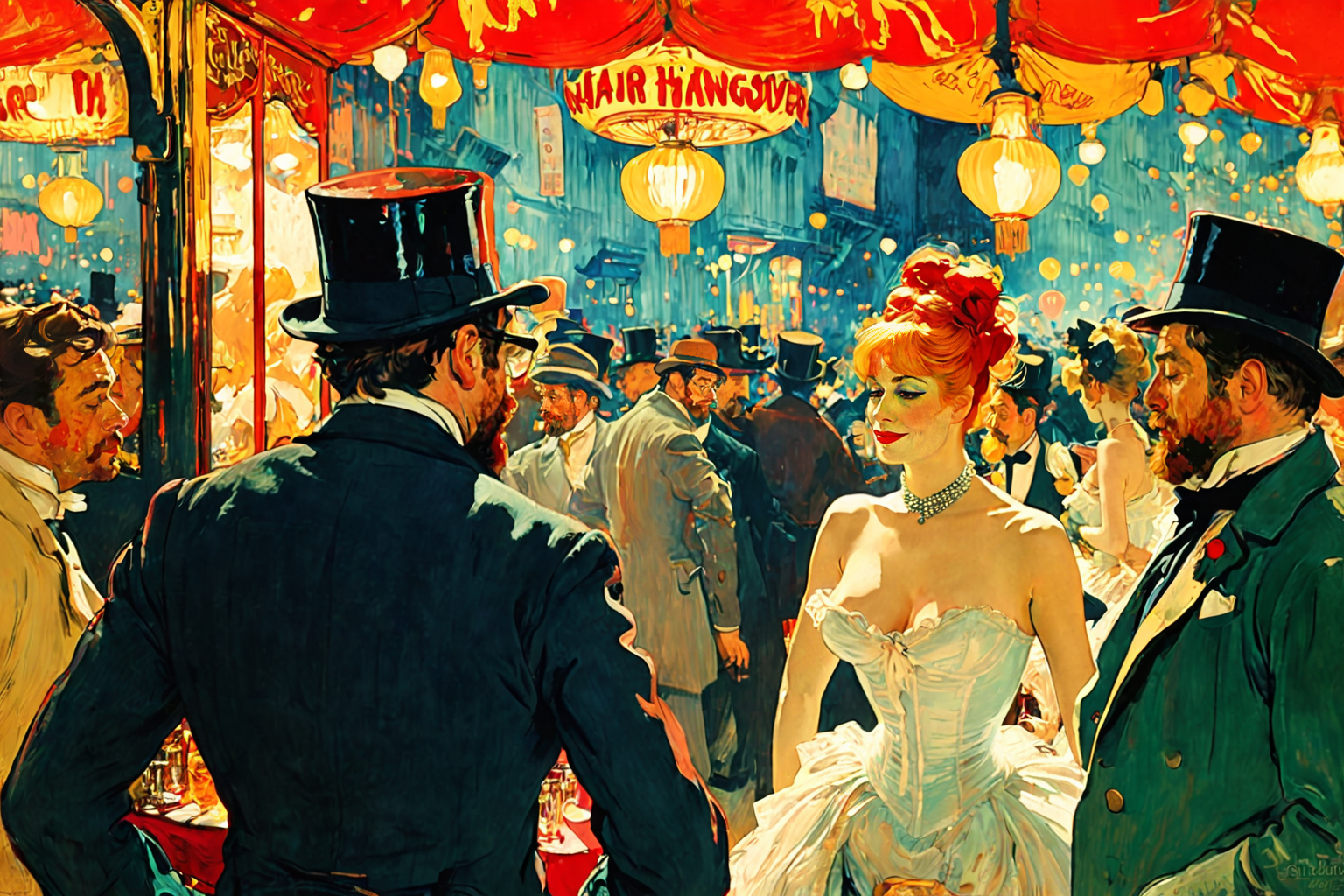NSFW, The Hangover by Henri de Toulouse-Lautrec , Henri de Toulouse-Lautrec, The Hangover, Moulin Rouge, Montmartre, Paris, cabaret, performers, energy, atmosphere, bohemian nightlife, late-night scene, flattened perspective, bold use of color, vibrant painting. HD, sharp focus, stunningly beautiful, Cel Shaded Art, 2D, flat color, toon shading, cel shaded style