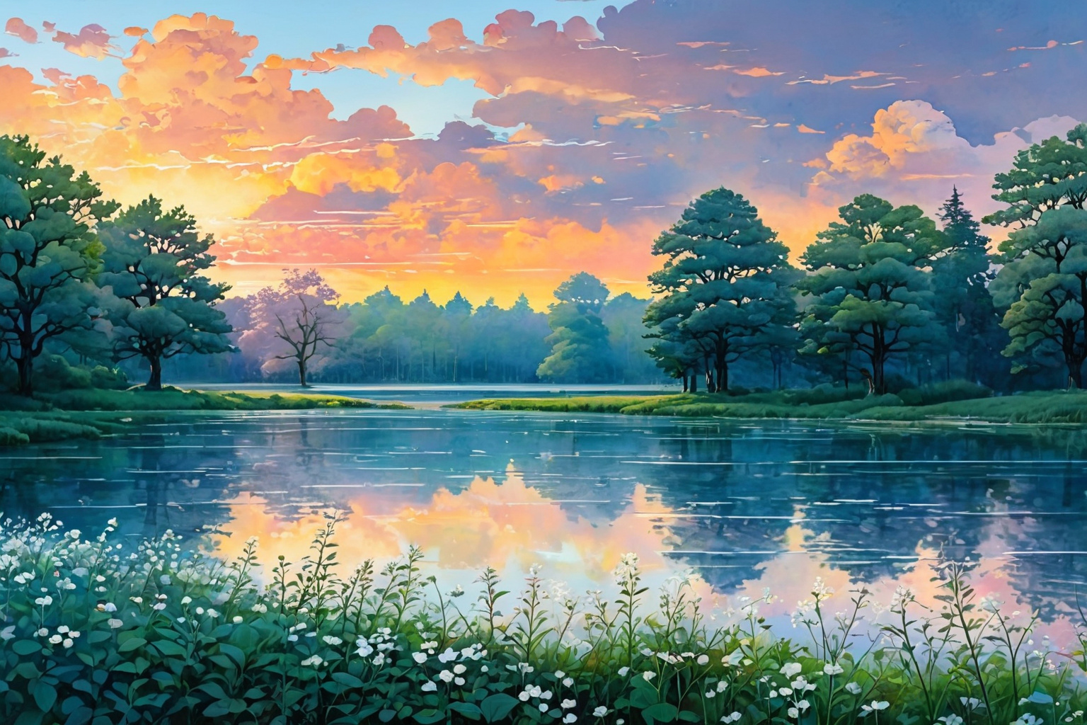 “A serene Estonian landscape unfolds at sunrise, bathed in a vibrant rainbow light. The scene is rendered in the soft Neoclassical style of Hugo Ball’s watercolor paintings. The sky, a mesmerizing blend of pastel hues, transitions from deep violet to fiery orange, casting a kaleidoscopic glow over the tranquil countryside.