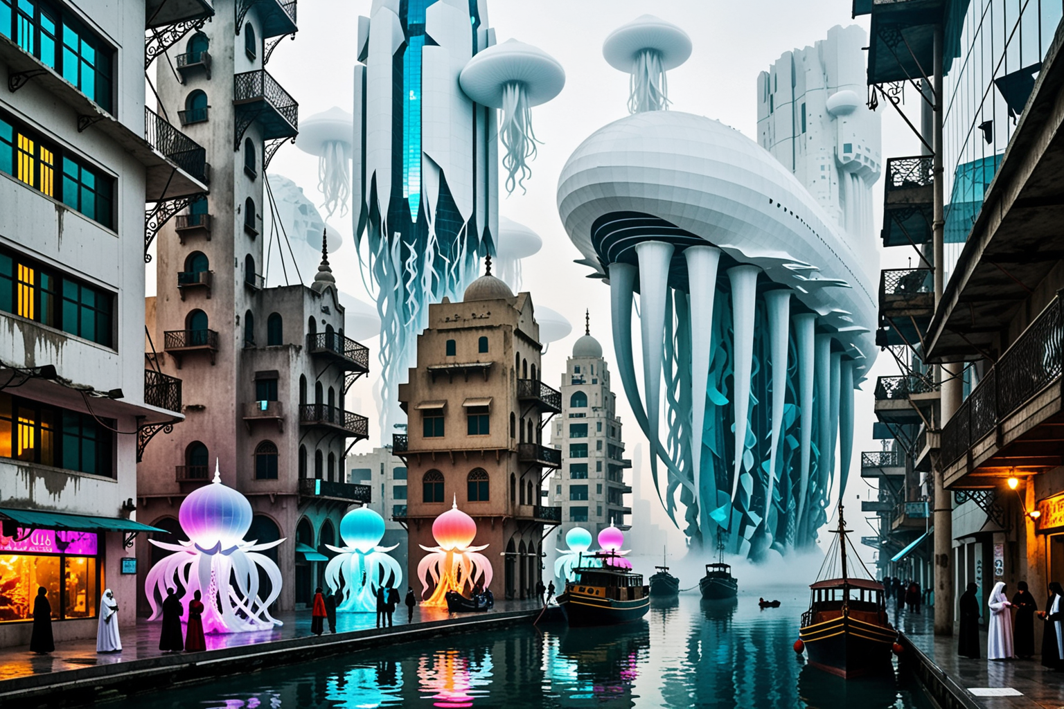 Paint an image of a futuristic cityscape in Kuwait at sunrise, with a surreal ‘iceberg’ weather phenomenon where gleaming white structures made of crystal-like material are scattered throughout the landscape, as if they’re melting into the atmosphere. The architecture is inspired by Empire style, with ornate details and grand proportions, executed in a Pulling and Scrapping technique reminiscent of Lyonel Feininger’s unique artistic style. The cityscape features a sprawling metropolis with towering skyscrapers, bustling streets, and airships docked at the waterfront, while strange creatures like iridescent winged horses and luminescent jellyfish drift through the icy fog.