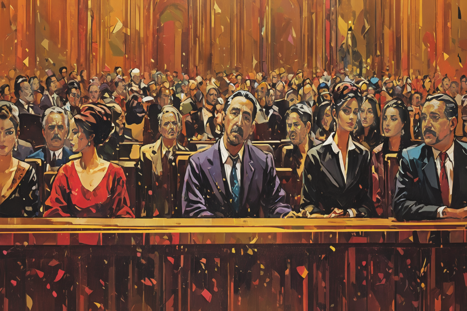 jury, Francisco Infante style, HD, sharp focus, stunningly beautiful, abstract style, non-representational, colors and shapes, expression of feelings, imaginative, highly detailed