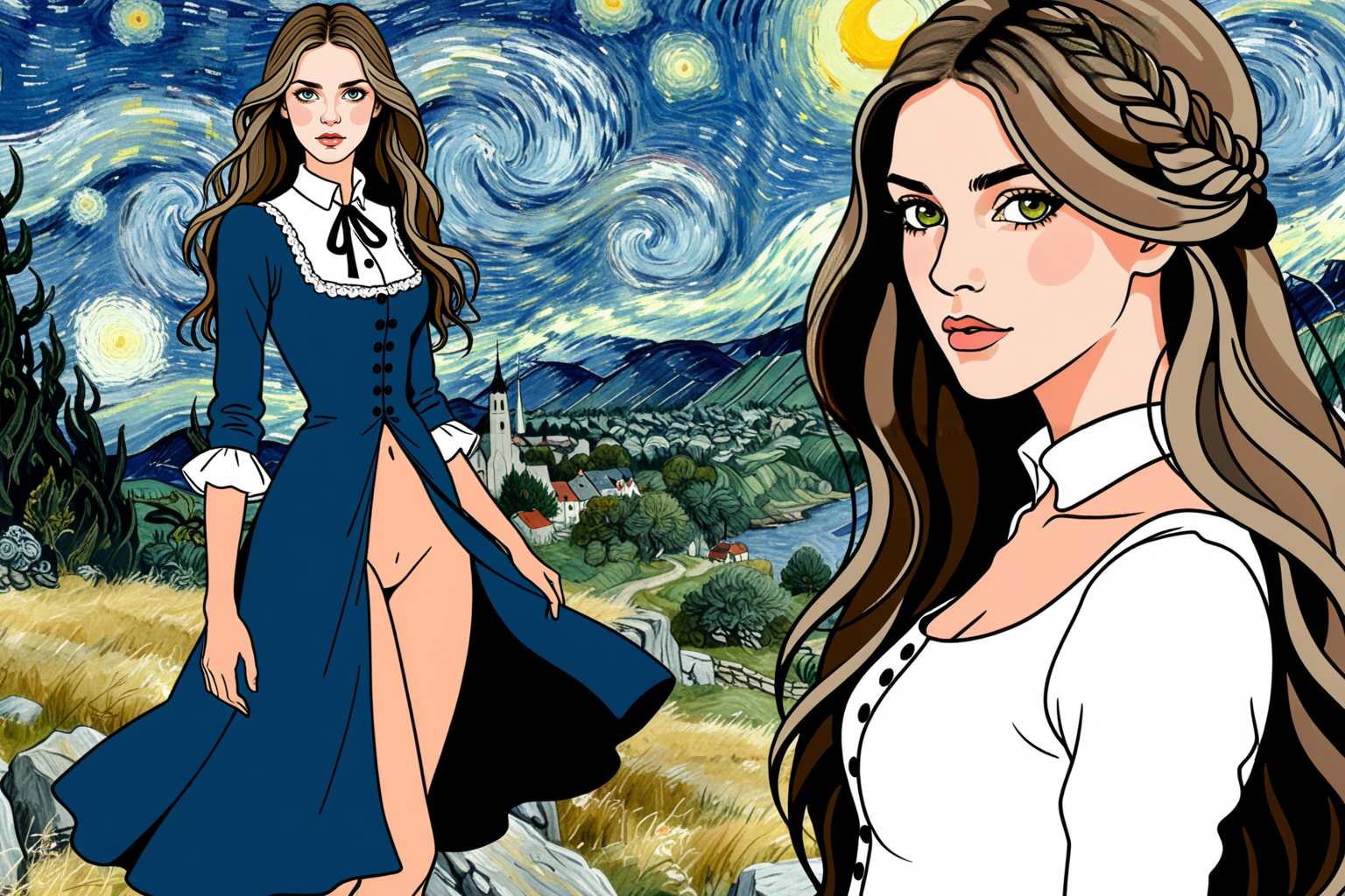 young woman, beautiful face, standing, great body, gorgeous figure, long legs, pretty eyes, long hair, aixCB by Virtuals style, beautiful background, magnificent scenery, Caspar David Friedrich style, HD, sharp focus, stunningly beautiful, Doodle Art Style, drawing, freeform, swirling patterns, doodle art style