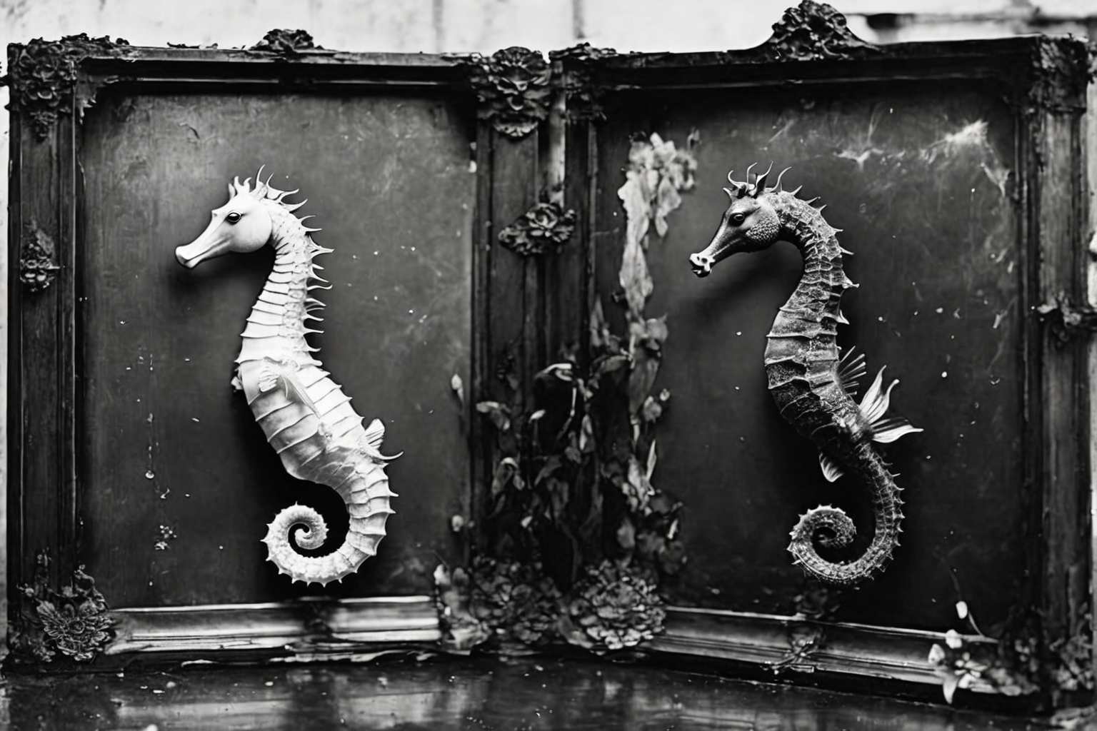 NSFW, Seahorse, Giovanni Antonio Canaletto style, HD, sharp focus, stunningly beautiful, daguerreotype photo, 1920s photography, historical photo, aged photo, black & white photography, damaged photo