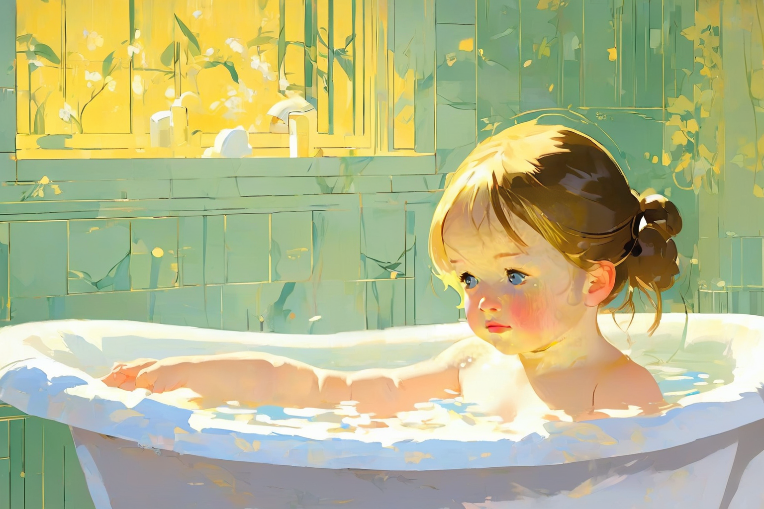 2. The scene portrays a mother gently bathing her young child, capturing an intimate moment between the two figures.