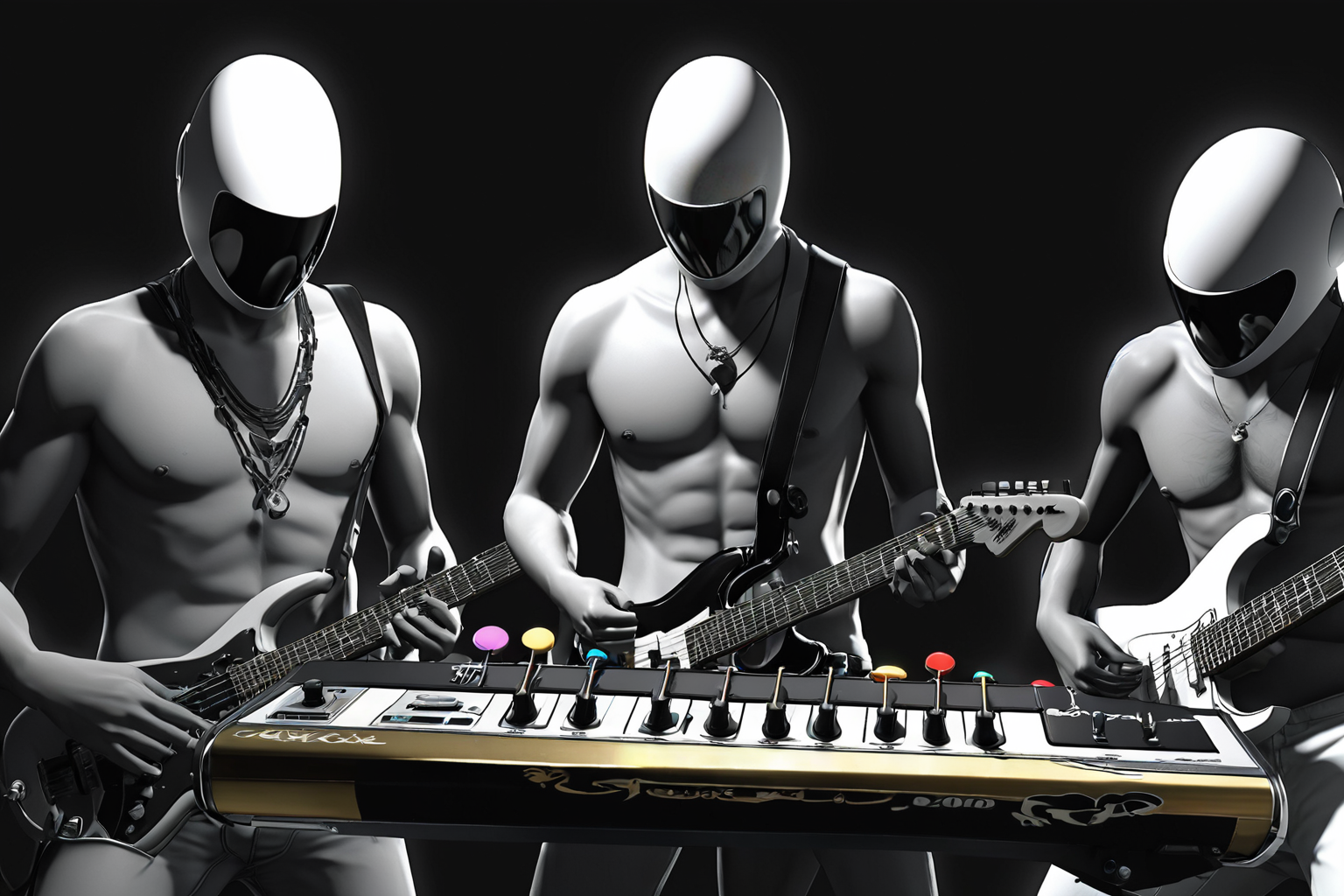 NSFW, Game: Rock Band (2007), Giovanni Antonio Canaletto style, Rock Band (2007), music, video game, band, players, instruments, controllers, immersive, fun, iconic, rock songs / HD, sharp focus, stunningly beautiful, Surrealism, expressive, dramatic, organic lines and forms, dreamlike and mysterious, Surrealism