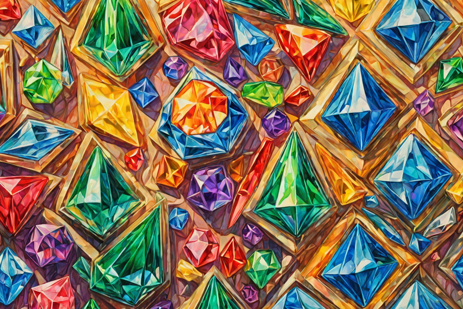 Game: Bejeweled (2001), Franz Marc style, Bejeweled, tile-matching puzzle video game, PopCap Games, browsers, 2001, over 75 million copies sold, over 150 million downloads, classic, genre. HD, sharp focus, stunningly beautiful, Colored Pencil Art, colored pencil strokes, light color, visible paper texture, colored pencil art