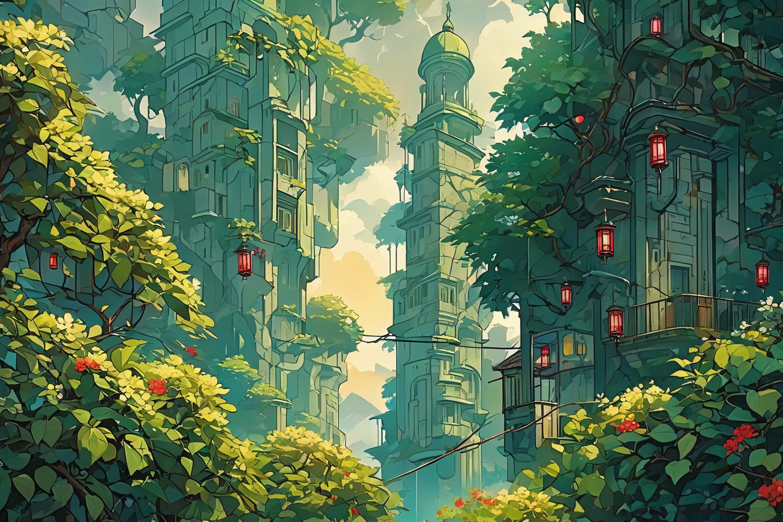 A serene morning in medieval Kotor, Montenegro, with the sun rising over the Bay of Kotor. A 1920s-inspired Art Deco scene unfolds, as Pavel Filonov’s Kalamkari Painting technique brings to life a majestic Custard Apple tree, its branches adorned with intricate geometric patterns and tiny lanterns. A few wispy clouds drift lazily across the sky as the city’s stone buildings and red-tiled roofs come alive in golden light. In the foreground, a delicate glass bottle filled with fresh flowers sits atop a ornate ceramic pedestal, surrounded by lush greenery and vines. The atmosphere is tranquil, inviting, and steeped in nostalgia.