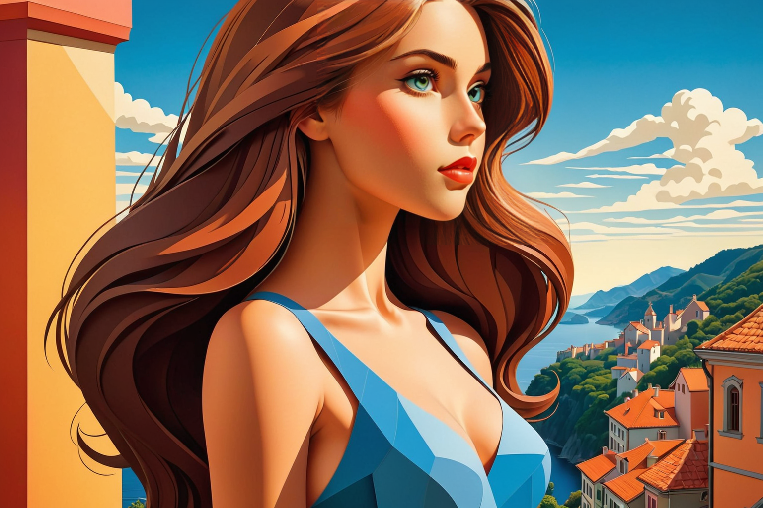 young woman, beautiful face, great body, gorgeous figure, long legs, pretty eyes, long hair, great bust, beautiful background, magnificent scenery, M. C. Escher style, HD, sharp focus, stunningly beautiful, flat papercut style, silhouette, clean cuts, paper, sharp edges, minimalist, color block