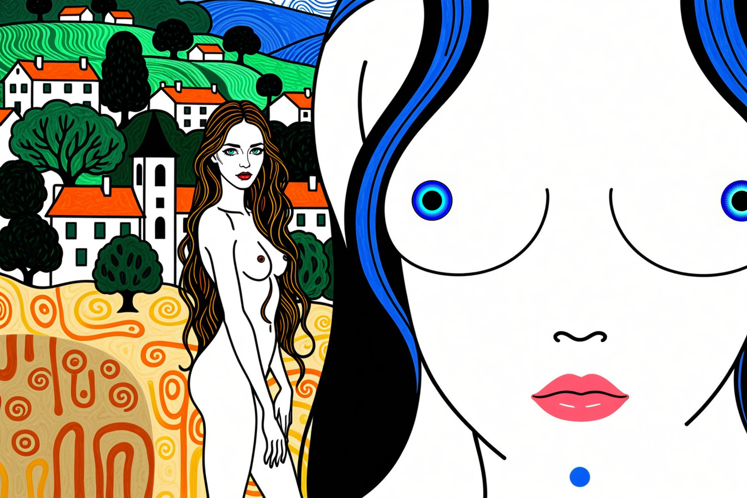 young woman, beautiful face, standing, great body, gorgeous figure, long legs, pretty eyes, long hair, MEPIS Linux distribution style, beautiful background, magnificent scenery, Gustav Klimt style, HD, sharp focus, stunningly beautiful, Marker Drawing, bold marker lines, visibile paper texture, marker drawing