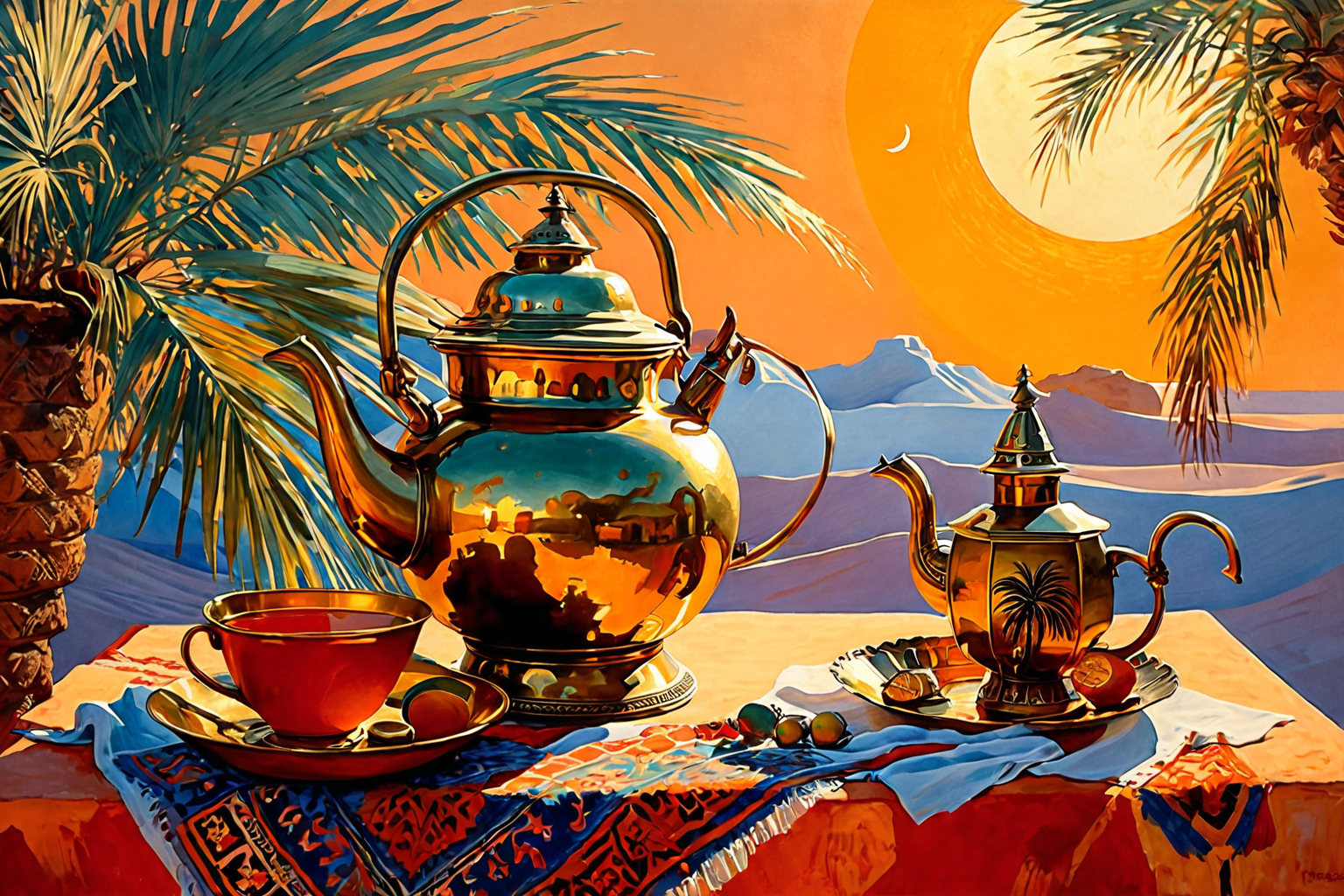 “A surreal still life painting in gouache technique portrays a Moroccan oasis at sunset during a lunar eclipse, with a faded moon in the sky. A vintage brass teapot and an antique lantern are illuminated by a mystical light, while a pair of ancient sandals lays nearby. The painting is inspired by artist Vladimir Tatlin’s surrealistic style.”