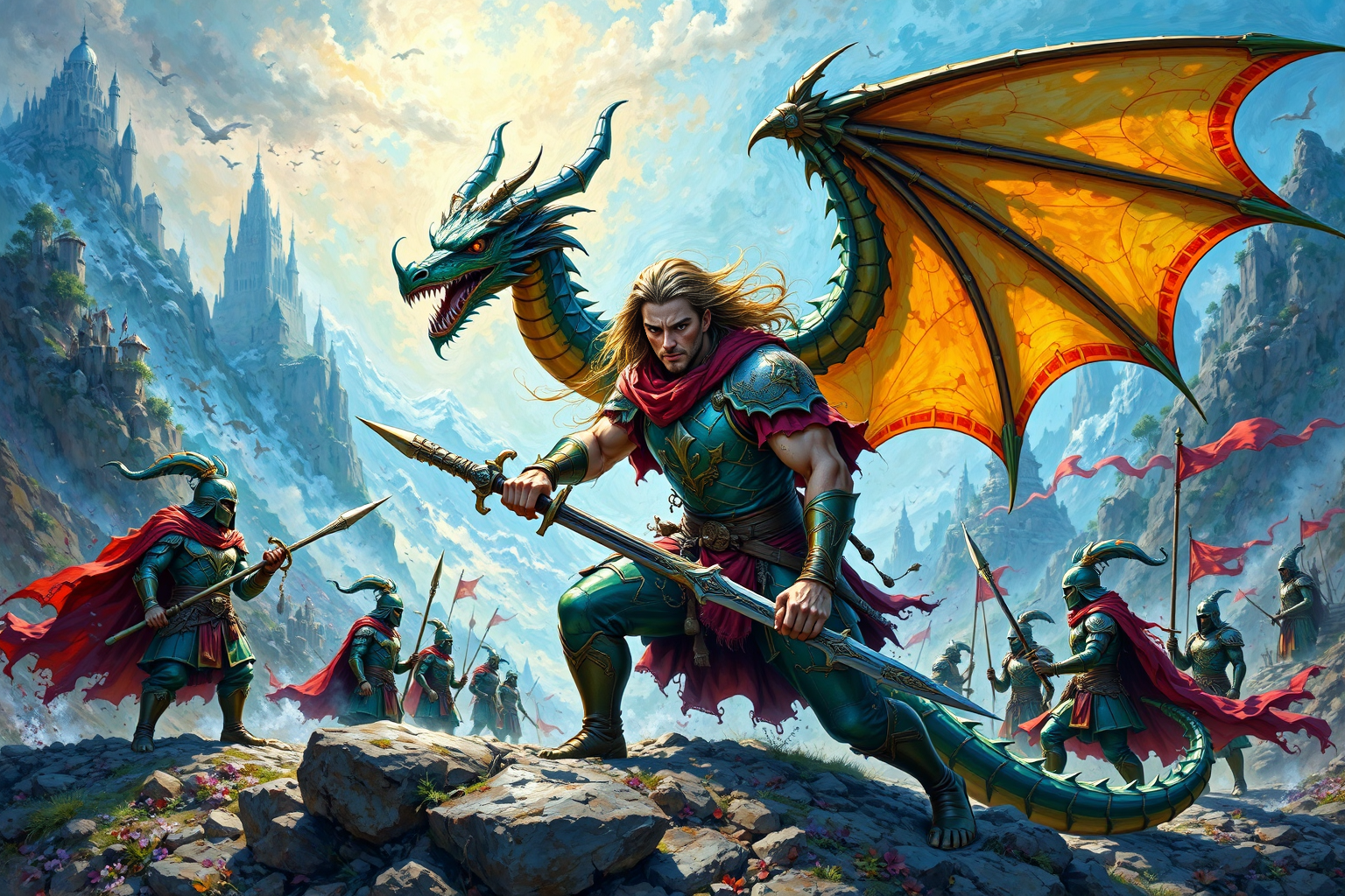 Game: Dragon Force (1996), Boris Kustodiev style, Dragon Force (1996), warrior, Legendra, world, fate, hands, brave, role-playing, strategy, warlords, unique storylines, Madruk, evil forces HD, sharp focus, stunningly beautiful, impressionist painting, loose brushwork, vibrant color, light and shadow play, captures feeling over form