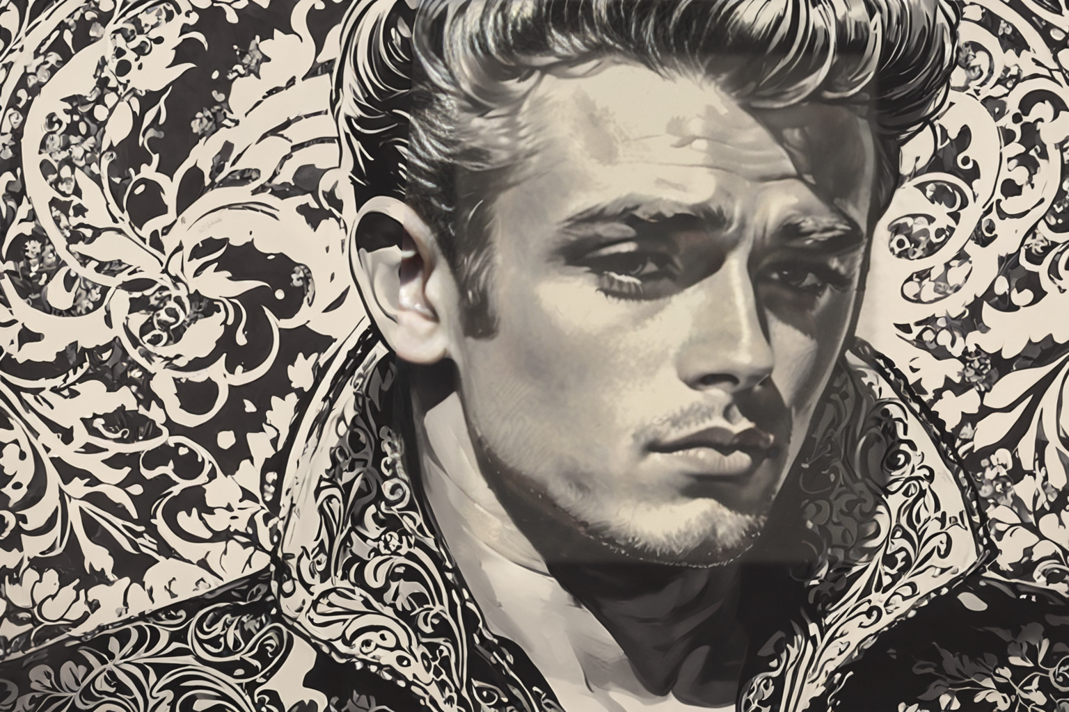 James Dean, portrait, Vitaly Komar style, HD, sharp focus, stunningly beautiful, Art Nouveau style, elegant, decorative, curvilinear forms, nature-inspired, ornate, detailed