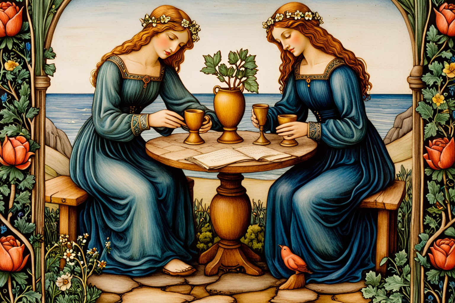 Six of Cups Tarot card, Edward Burne-Jones style, Six of Cups, nostalgia, cherished memories, innocence, kindness, fondness, childhood, core values, simpler joys, feelings and experiences, genuine happiness, reunion, heart’s desire, matters, warmth, optimism, reminiscing, old photos, beloved place, hobby, roots, small unexpected gift, kindness, clinging too tightly to past, allow yourself to move forward with gratitude, hopeful outlook for future, relationships, career, personal growth HD, sharp focus, stunningly beautiful, paper mache representation of, 3D, sculptural, textured, handmade, vibrant, fun
