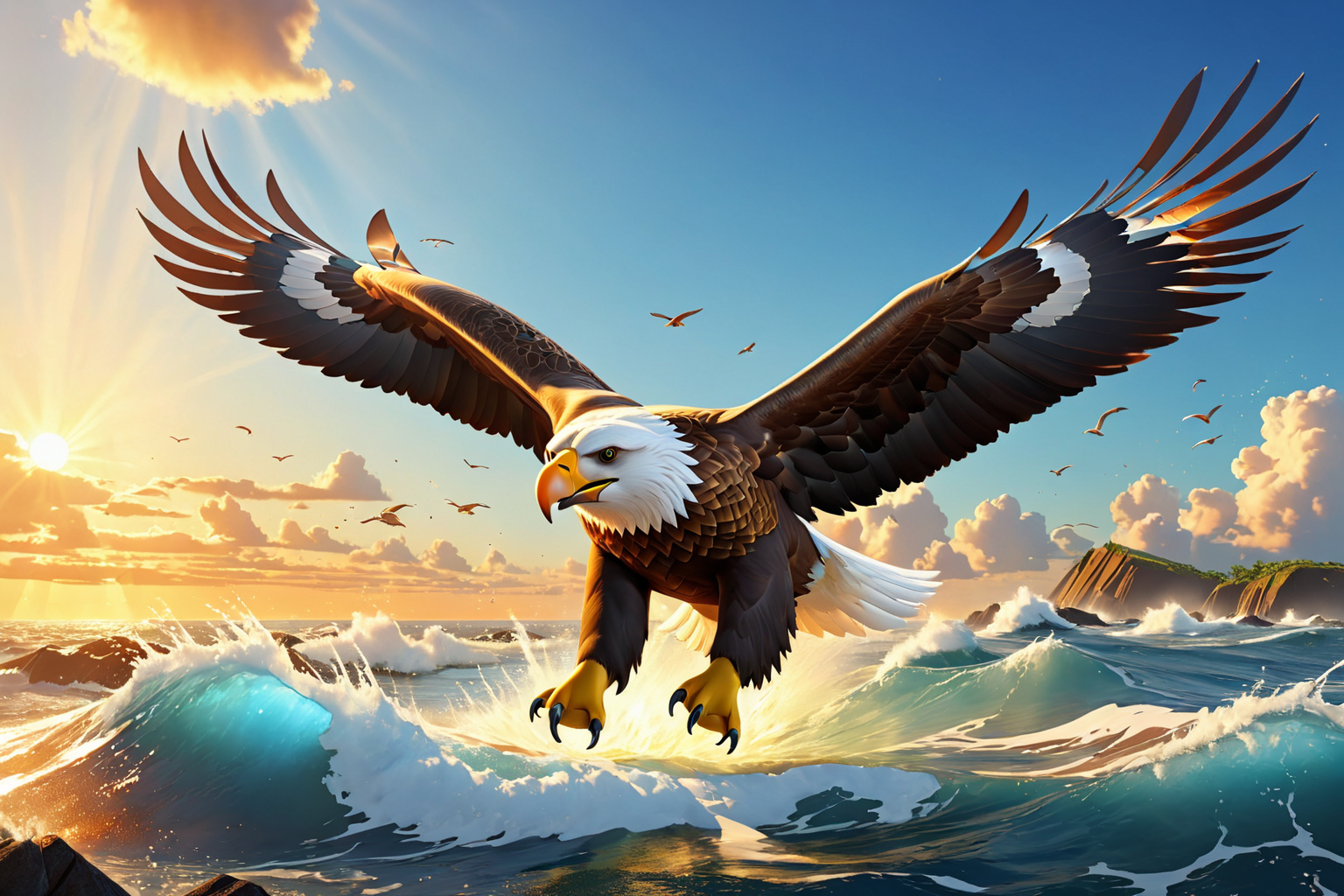 At dawn in a futuristic El Salvador, the sky glows with cosmic light as warm rays of sunlight illuminate the land. The splash painting technique of renowned artist El Lissitzky brings this Cosmism scene to life. A group of friendly walruses frolic in the ocean while a majestic eagle soars overhead, symbolizing harmony between nature and technology.