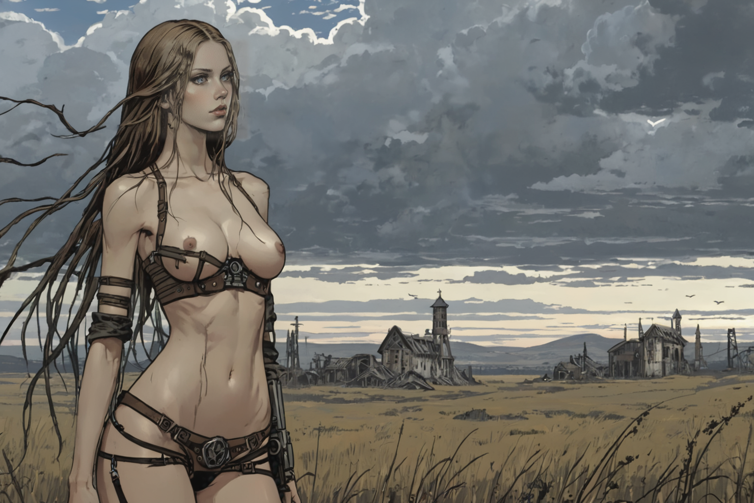 young woman, beautiful face, standing, great body, gorgeous figure, long legs, pretty eyes, long hair, Progex Linux distribution style, beautiful background, magnificent scenery, Viktor Vasnetsov style, HD, sharp focus, stunningly beautiful, dystopian style, bleak, post-apocalyptic, somber, dramatic, highly detailed